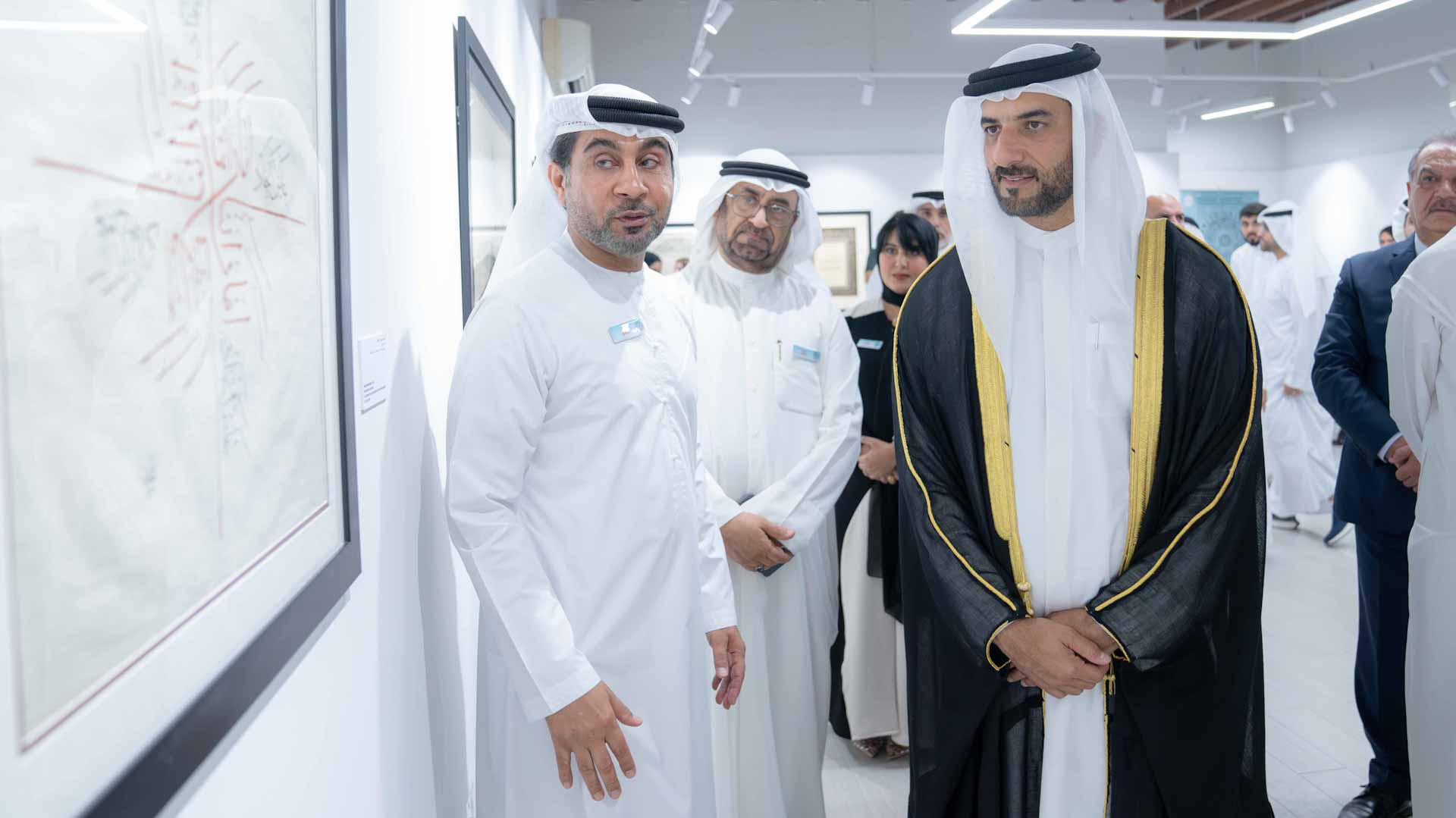 رافق سموه خلال الجولة كل من معالي محمد المر رئيس مجلس إدارة مكتبة محمد بن راشد آل مكتوم، وعبد الله بن محمد العويس رئيس دائرة الثقافة، وعائشة راشد ديماس مدير عام هيئة الشارقة للمتاحف، وجمع غفير من الفنانين والخطاطين والإعلاميين والمهتمين بفن الخط العربي.