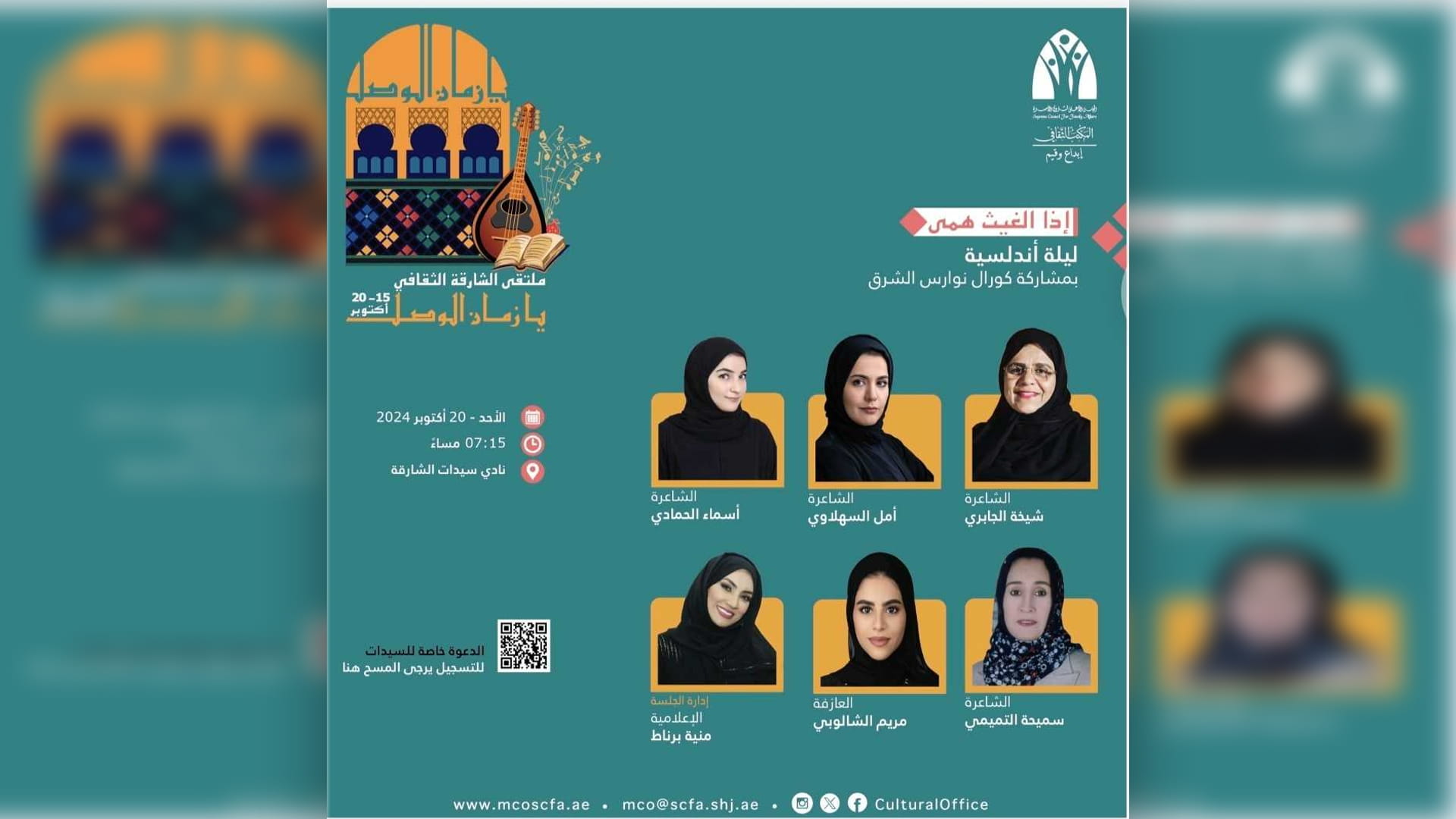 وفي ختام الملتقى، وضمن فعاليات "إذا الغيث همى"، ستكون الحاضرات على موعد مع ليلة أندلسية، بمشاركة كورال نوارس الشرق، والشاعرات شيخة الجابري، وأمل السهلاوي، وأسماء الحمادي، وسميحة التميمي، وعلى العزف مريم الشالوبي، وتدير الجلسة الإعلامية منية برناط.
