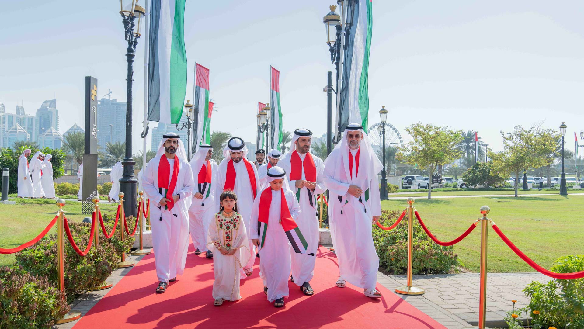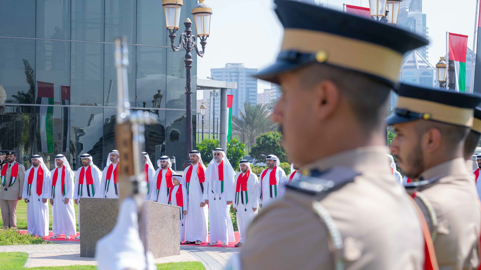 وتفضل سمو ولي عهد الشارقة وعند تمام الحادية عشرة صباحاً، بالإيذان ببدء مراسم رفع العلم، بمشاركة ضباط وأفراد من القيادة العامة لشرطة الشارقة والفرقة الموسيقية العسكرية لأكاديمية الشارقة للعلوم الشرطية التي عزفت السلام الوطني لدولة الإمارات العربية المتحدة، حيث ارتفع علم البلاد عالياً في سماء الوطن، اعتزازاً بيوم العلم.