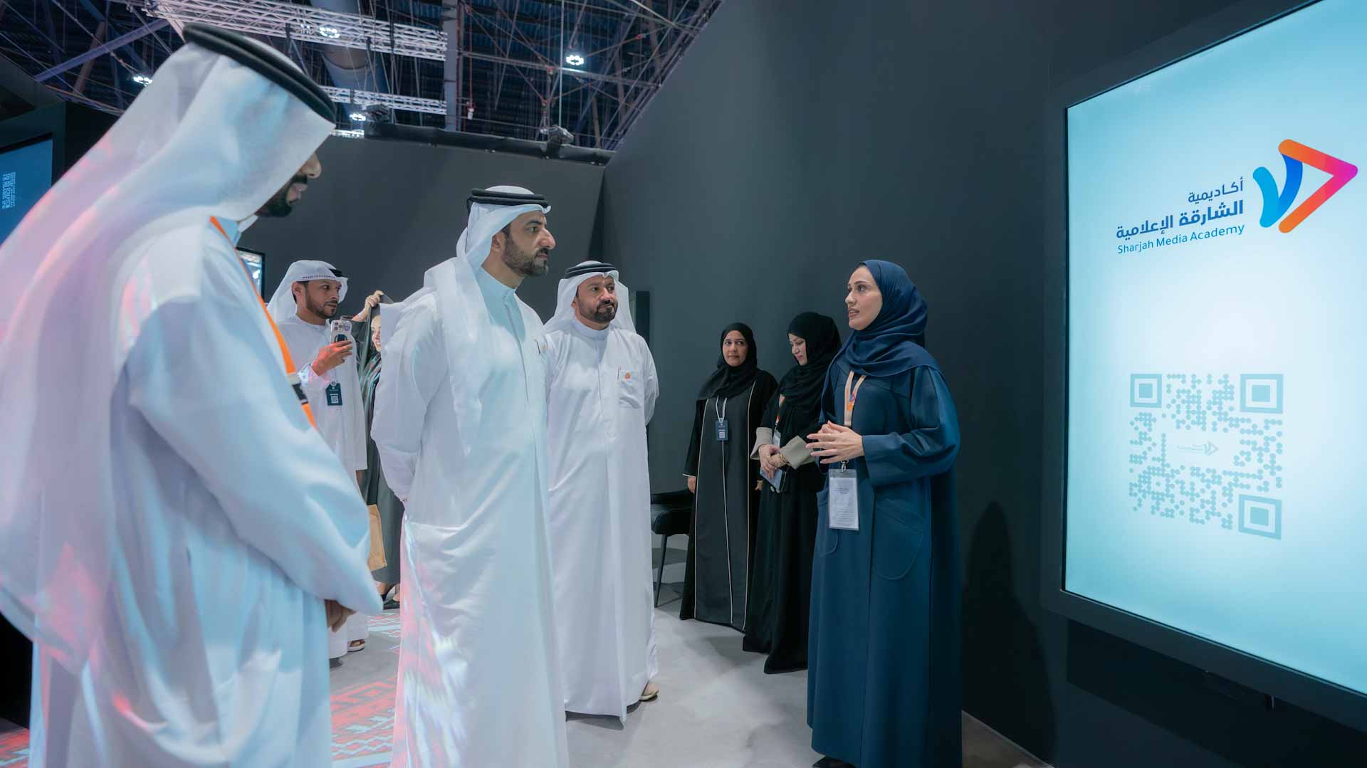 وكان في استقبال سموه لدى وصوله معالي الشيخ عبد الله بن محمد بن بطي آل حامد، رئيس المكتب الوطني للإعلام، ومحمد حسن خلف، مدير عام هيئة الشارقة للإذاعة والتلفزيون، وطارق سعيد علاي، مدير عام المكتب الإعلامي لحكومة الشارقة، وحسن يعقوب المنصوري، أمين عام مجلس الشارقة للإعلام، وراشد عبد الله العوبد، مدير مدينة الشارقة للإعلام "شمس"، وسالم علي الغيثي، مدير هيئة الشارقة للإذاعة والتلفزيون، وعلياء بو غانم السويدي، مدير المكتب الإعلامي لحكومة الشارقة، وعدد من المسؤولين والإعلاميين.