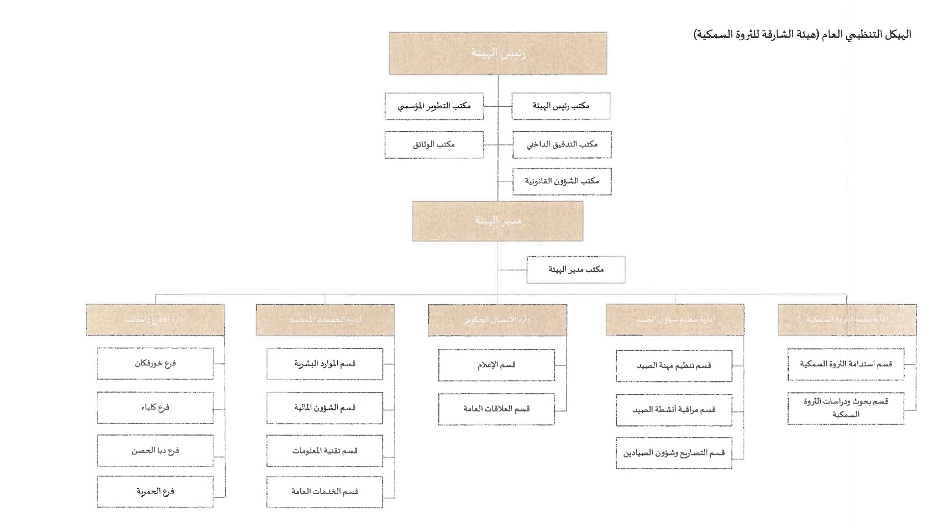 ونص المرسوم على أن يُعتمد الهيكل التنظيمي العام لهيئة الشارقة للثروة السمكية المرفق بهذا المرسوم، على أن يُصدر المجلس التنفيذي بقراراتٍ منه ما يلي: الهيكل التنظيمي التفصيلي للهيئة، والقرارات اللازمة لتنفيذ هذا المرسوم بما في ذلك اعتماد التوصيف الوظيفي لمهام الوحدات التنظيمية في الهيئة بما يتفق واختصاصاته، واستحداث أو دمج أو إلغاء أية وحدات تنظيمية تتبع الإدارات المُدرجة ضمن الهيكل التنظيمي العام.