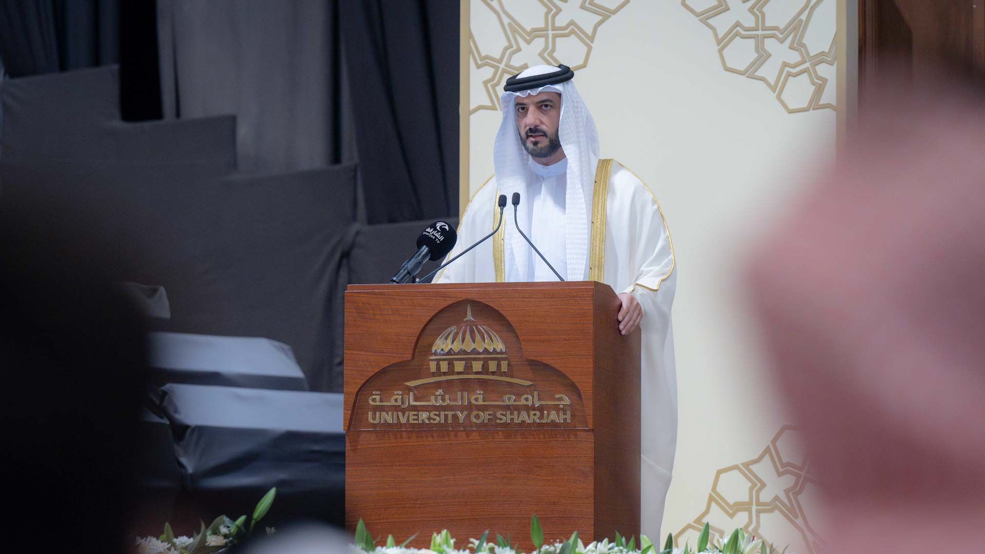 ودعا سمو رئيس جامعة الشارقة الخريجين إلى التسلح بالعزيمة والإيمان بالقدرات قائلاً: "قد تواجهون في طريقكم صعوبات وقد يطرق الشك أبوابكم، لكن تذكروا دائماً أن العزيمة هي وقود النجاح، وأن المستحيل مجرد كلمة أمام من يؤمن بقدراته، فكونوا أولئك الذين لا يهابون التحديات، بل يتحدونها ويصنعون منها سلالم للصعود".