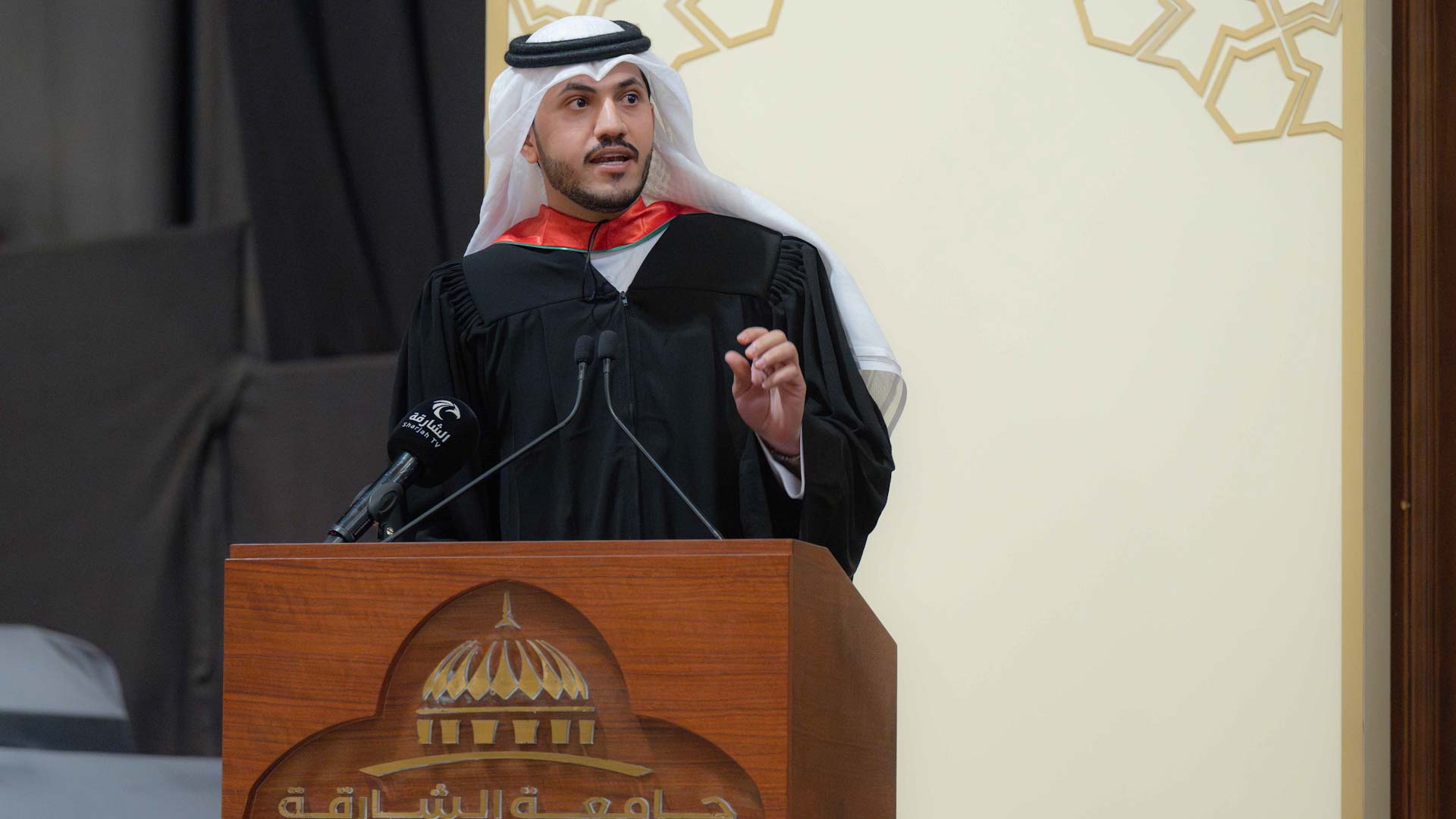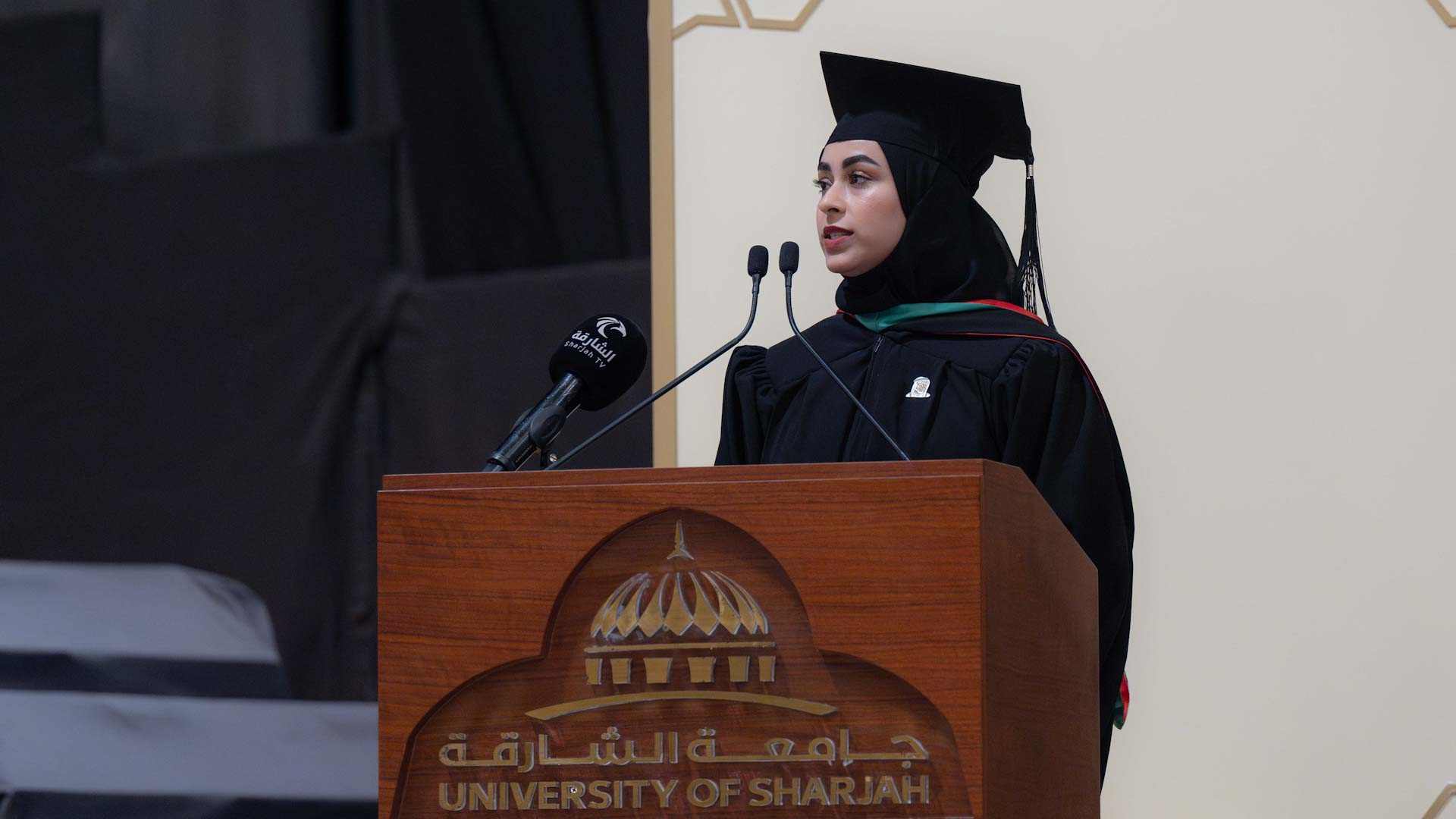 وأضافت المزروعي: "أقف أمامكم اليوم ممثلةً لكل زملائي وزميلاتي الخريجين والخريجات، معبرةً بصوت واحد عن امتناننا جميعاً لكل من ساهم في تأسيس وارتقاء هذا الصرح العلمي العظيم، ووفر لنا بيئةً تعليميةً رائدةً تجمعُ بين التميزِ والإبداع، وأوجه شكري وتقديري لسمو رئيس جامعة الشارقة، الذي شاركنا اليوم فرحتنا، مبرزاً حرصه الدائم على دعم الشباب وتمكينهم ليكونوا رواداً في بناء المستقبل المشرق".