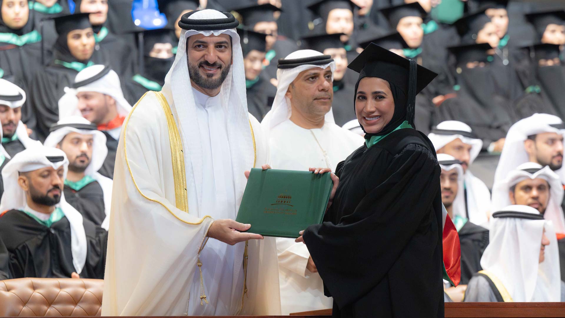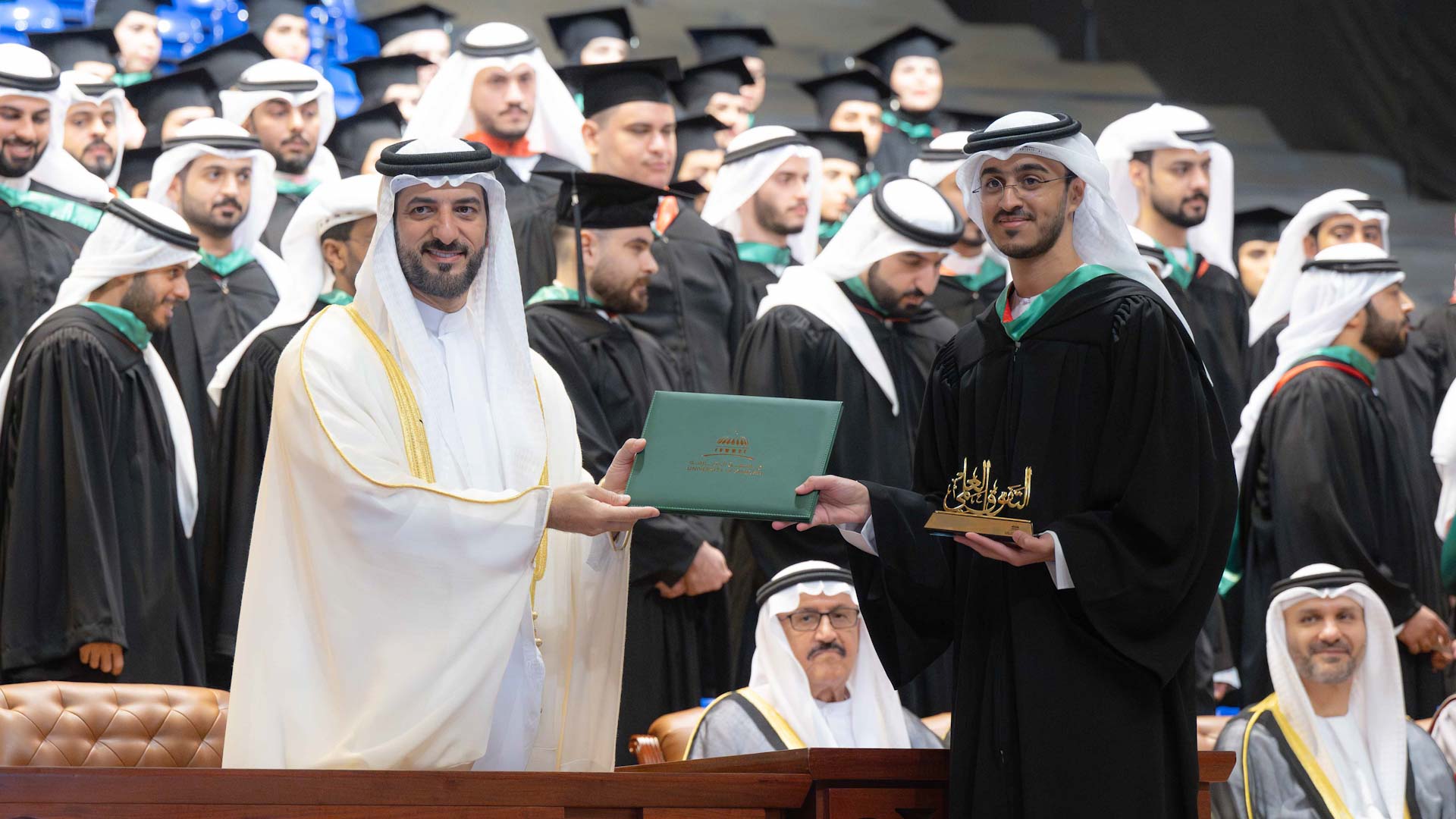 وتفضل سمو رئيس جامعة الشارقة بتسليم الطلبة الخريجين والخريجات شهادات تخرجهم مهنئاً إياهم هذا الإنجاز والتفوق، راجياً لهم التوفيق والسداد في حياتهم المستقبلية.