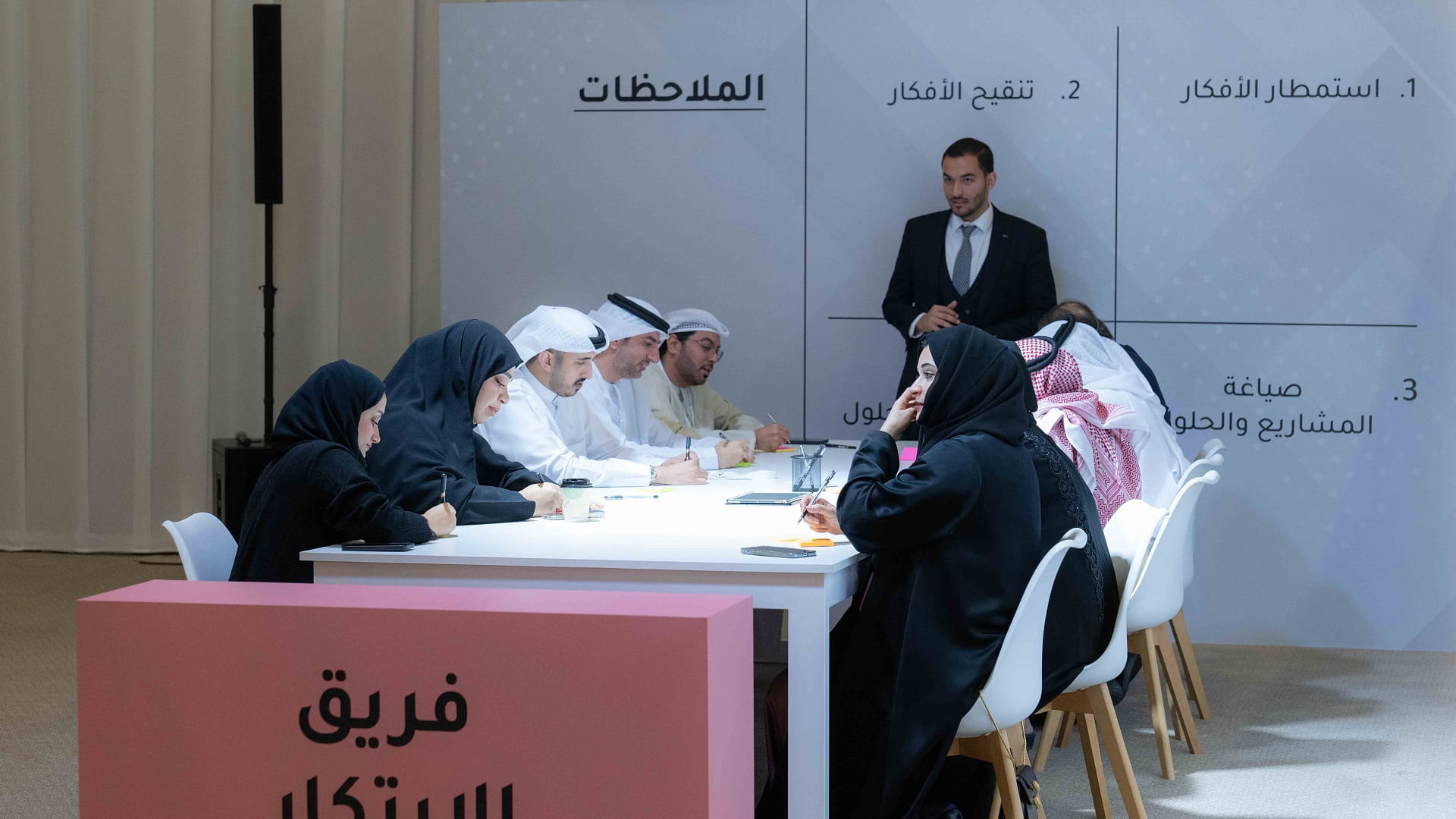 كما تابع سموه خلال الحفل الورش المصاحبة ونشاط العصف الذهني لفرق العمل التي تم تشكيلها بهدف وضع الحلول والمقترحات للتحديات الأربعة لمستقبل الإعلام، التي طرحها سموه خلال كلمته في الحفل، وبعد انتهاء الفرق من النشاط قدم كل فريق شرحاً حول نتائج المبادرات، والمشاريع المقترحة للتحديات المطروحة.