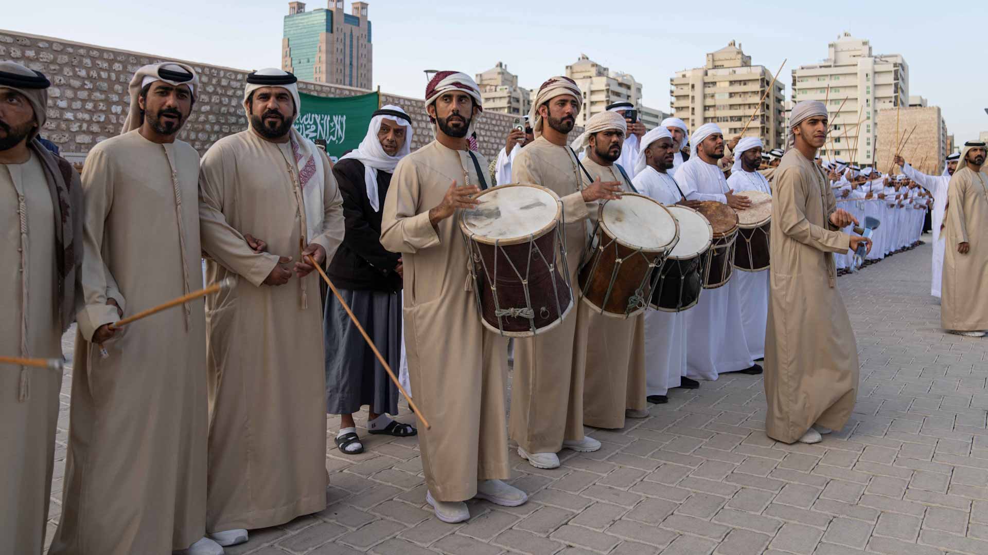 واستُقبل موكب صاحب السمو حاكم الشارقة لدى وصوله إلى منطقة قلب الشارقة بعروض الفرق الشعبية المتنوعة التي احتفت بقدوم سموه، وحيّته بالأهازيج التقليدية مثل الندبة والعيالة والحربية والهبان.
