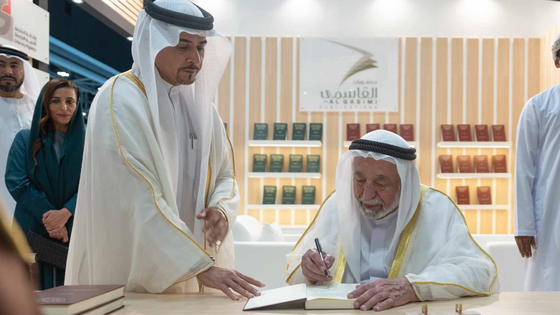 ورافق سموه خلال الزيارة كل من الشيخة بدور بنت سلطان القاسمي رئيسة مجلس إدارة هيئة الشارقة للكتاب، ومعالي خالد بن هلال البوسعيدي وزير ديوان البلاط السلطاني العماني، ومعالي محمد بن نخيرة الظاهري سفير الدولة لدى سلطنة عُمان الشقيقة، وسعادة عبد الله محمد العويس رئيس دائرة الثقافة، وسعادة أحمد بن ركاض العامري الرئيس التنفيذي لهيئة الشارقة للكتاب، وسعادة محمد عبيد الزعابي رئيس دائرة التشريفات والضيافة، وسعادة محمد حسن خلف مدير عام هيئة الشارقة للإذاعة والتلفزيون، وسعادة طارق سعيد علاي مدير عام المكتب الإعلامي لحكومة الشارقة، وعدداً من كبار المسؤولين.