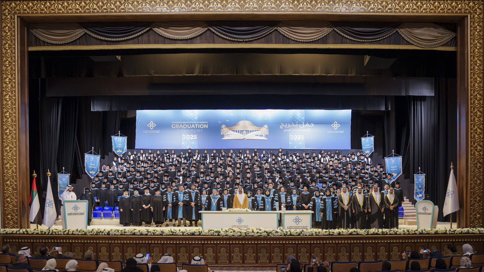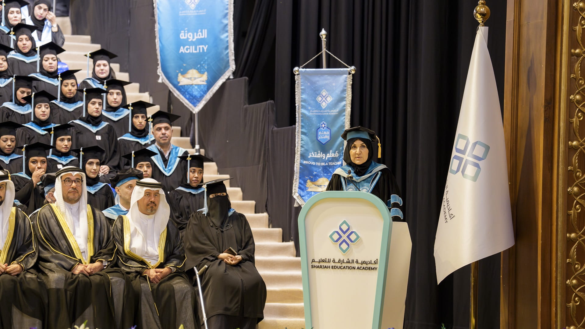 واختتمت الدكتورة محدثة الهاشمي كلمتها برسالة إلى الخريجين والخريجات من المعلمين والمعلمات قائلةً: أنتم سفراء التميز، وأنتم حملة راية الرؤية التي قوامها "تعليم متميز"، وذلك لن يتحقق إلا إذا جعلتم من الإخلاص غاية، ومن التفاني راية، ومن الجد والاجتهاد والتعلّم المستدام شعاراً، نحن نتطلع بثقة إلى غدٍ تقوده جهودكم المظفّرة، يراعي المتغيرات المتسارعة ويواكب تطلعات الدولة، ويقدّم الشارقة منارة ومنبراً، ويرفد الطلاب بكل احتياجاتهم، ولذلك نقول لكم: كونوا رؤساء المعنى المؤسسي، أي جسّدوا مهامكم، كصناع قرار فاعلين، مؤثرين، منطلقين من شغف بالتعليم والذي هو نهج إمارة الشارقة.