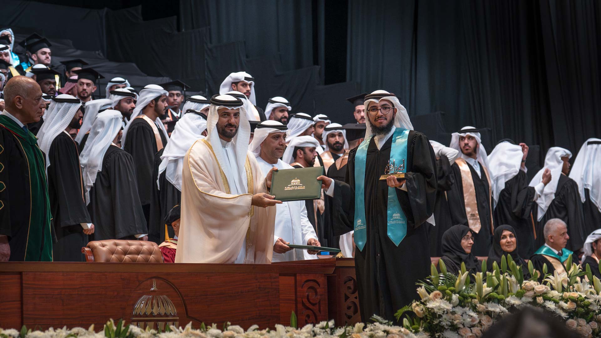 وتفضل سمو الشيخ سلطان بن أحمد القاسمي بتسليم الشهادات للطلاب الخريجين من كافة برامج البكالوريوس في كليات الشريعة والدراسات الإسلامية، والآداب والعلوم الإنسانية والاجتماعية، وإدارة الأعمال، والهندسة، والقانون، والفنون الجميلة والتصميم، والاتصال، والعلوم، والحوسبة المعلوماتية، والسياسات العامة، مباركاً سموه للخريجين ومتمنياً لهم التوفيق والنجاح في حياتهم المستقبلية.