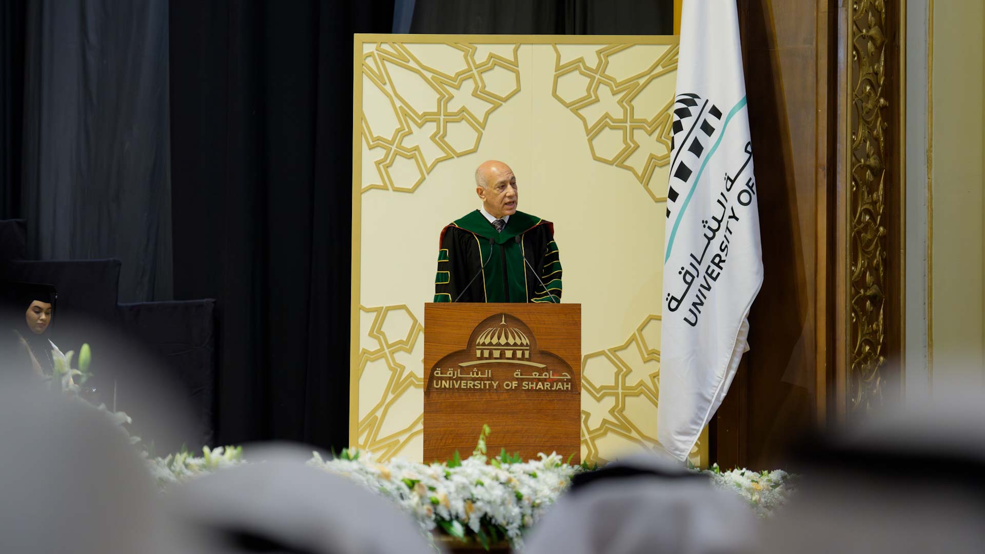 وأشار عجمي إلى أن جامعة الشارقة تحتفل اليوم بتخرج كوكبة مميزة من طالبات الكليات المختلفة بالجامعة، والتي تجسد ركائز البناء الحضاري، والتنمية الوطنية، وتميز المستقبل، موضحاً بأن هذا الحفل هو ختام سلسلة احتفالات التخرج لهذا العام، متناولاً أبرز الأرقام التي حققتها الجامعة منذ تأسيسها على يد صاحب السمو الشيخ الدكتور سلطان بن محمد القاسمي عضو المجلس الأعلى حاكم الشارقة، في عام 1997، حيث تخرج منها أكثر من 48 ألف خريج وخريجة، يشغلون اليوم مواقع قيادية، ويساهمون في تنمية مجتمعاتهم داخل الدولة وخارجها، ذاكراً بأن 65% من طلبة الجامعة وخريجيها من الطالبات، وهذا يعبر عن الدور المحوري للمرأة ووزنها النوعي في نسيج الجامعة ومسيرتها.