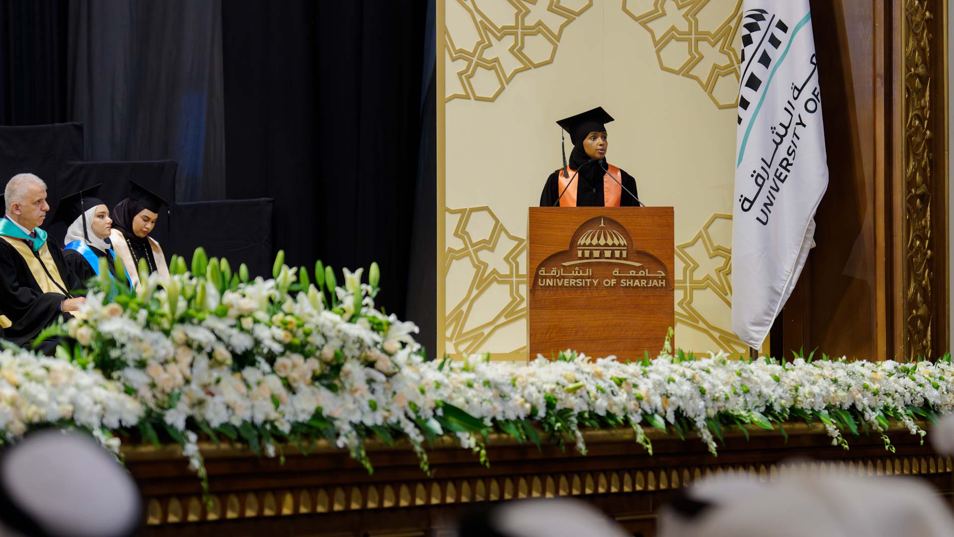 وأكدت الخريجة حفصة أن التعب يُثمر، وأن كل خطوة بثبات تُزهر، وأن الطريق مهما طال، فنهايته نور ومجد يستحق، مهنئةً الخريجات الذين خرجن بقلوب منتصرة، وأرواح تعانق السماء، يعتلين منصة ما كانت لتضاء، لولا وهج البدايات وسهر الليالي، موجهة شكرها الجزيل إلى صاحب السمو حاكم الشارقة الذي كان للعلم أبا، وللنهضة ربانا، وللفكر جناحا يحلق بالأجيال نحو الآفاق.