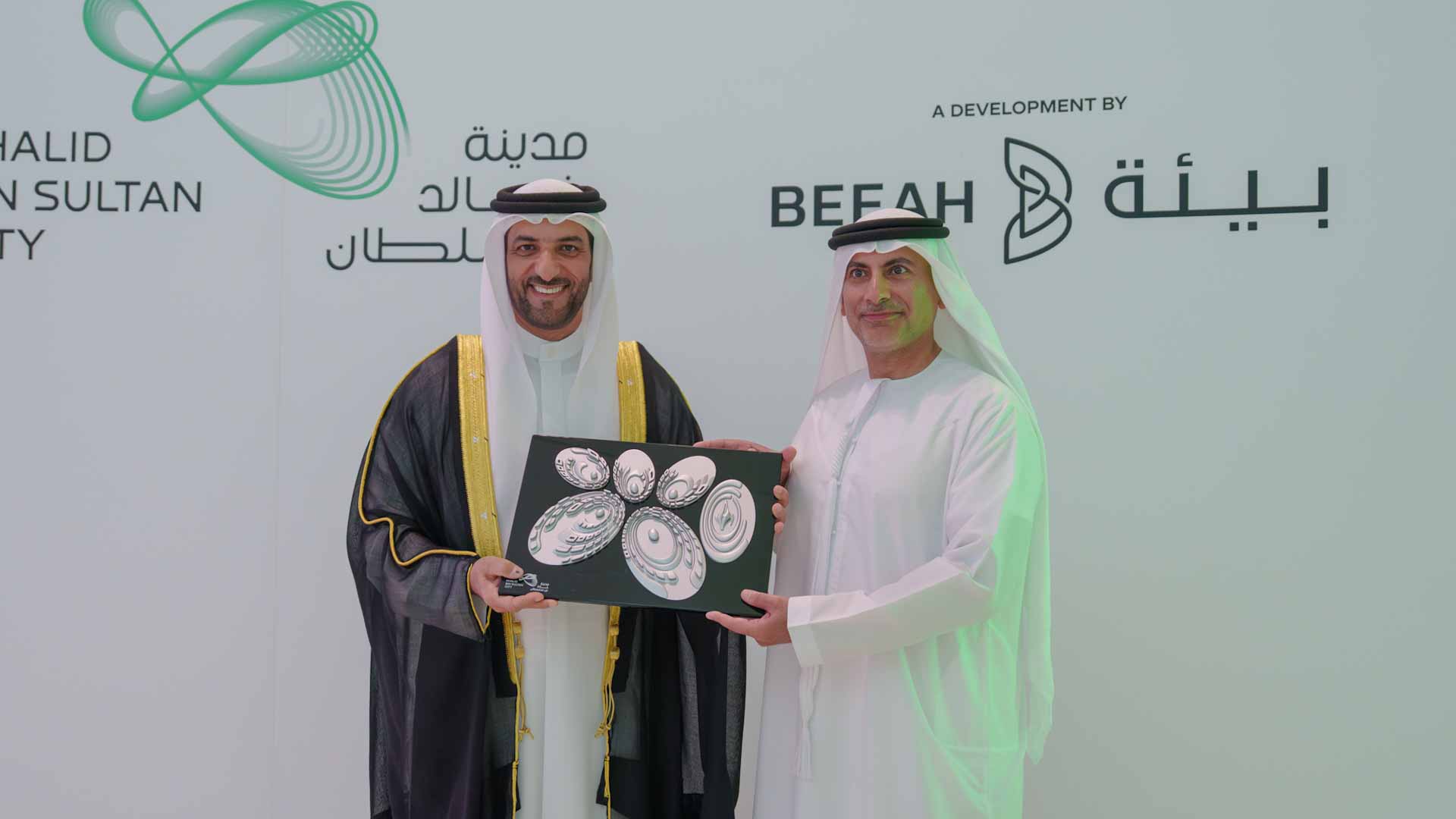 وفي نهاية الجولة، تسلم سمو نائب حاكم الشارقة درعاً تذكارياً يحمل تصميم مدينة خالد بن سلطان، تقديراً وعرفاناً من مجموعة "بيئة" على تشريف سموه للحفل.