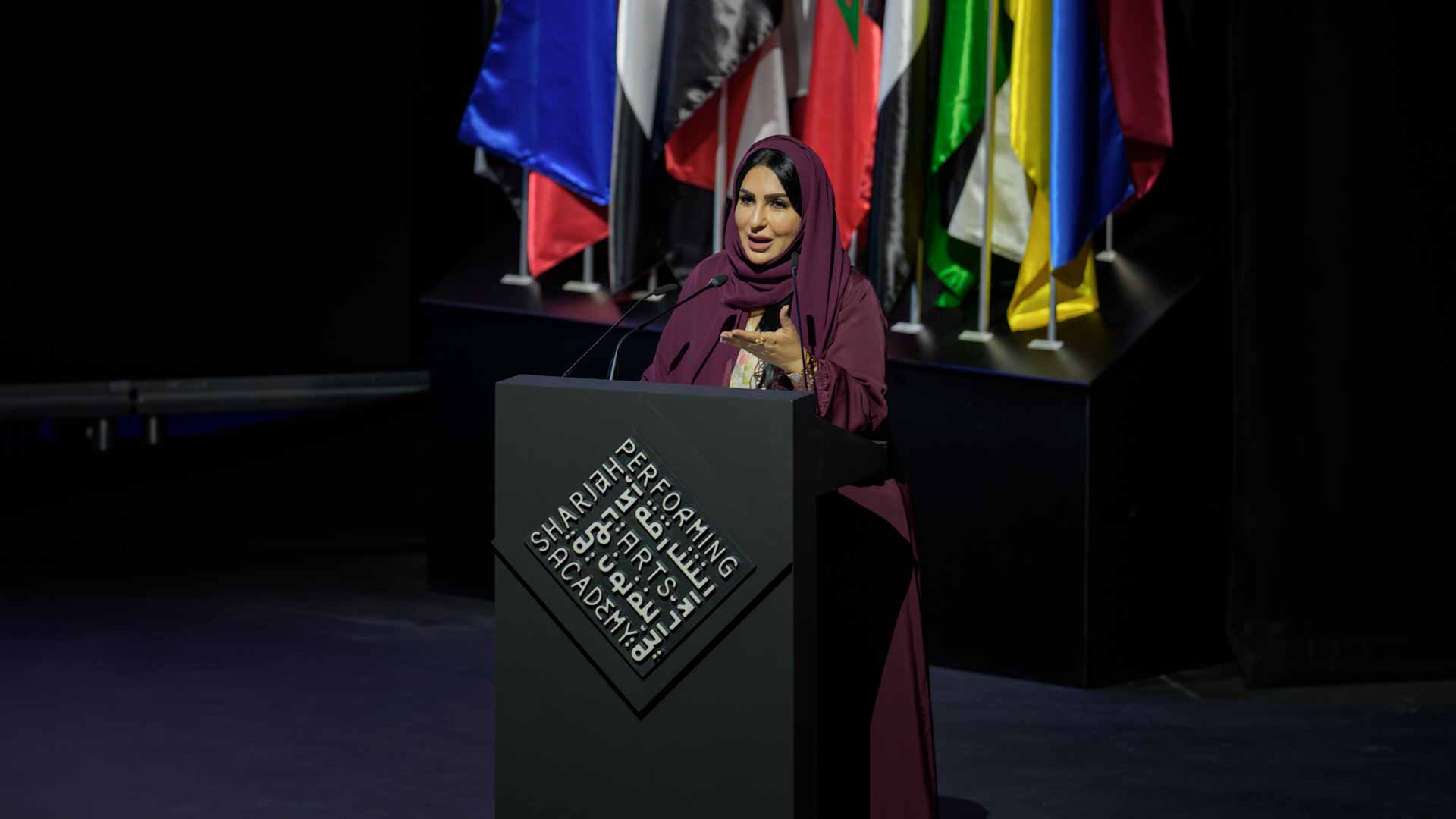 من جانبها، ألقت الفنانة زينب العسكري كلمة ضيف شرف الحفل، معبرةً خلالها عن سعادتها الكبيرة لإتاحة الفرصة بالتواجد في مثل هذا الصرح الفني المميز، والحفل البهيج الذي يحتفي بفناني المستقبل، وزاده رونقاً تشريف صاحب السمو رئيس أكاديمية الشارقة للفنون الأدائية.