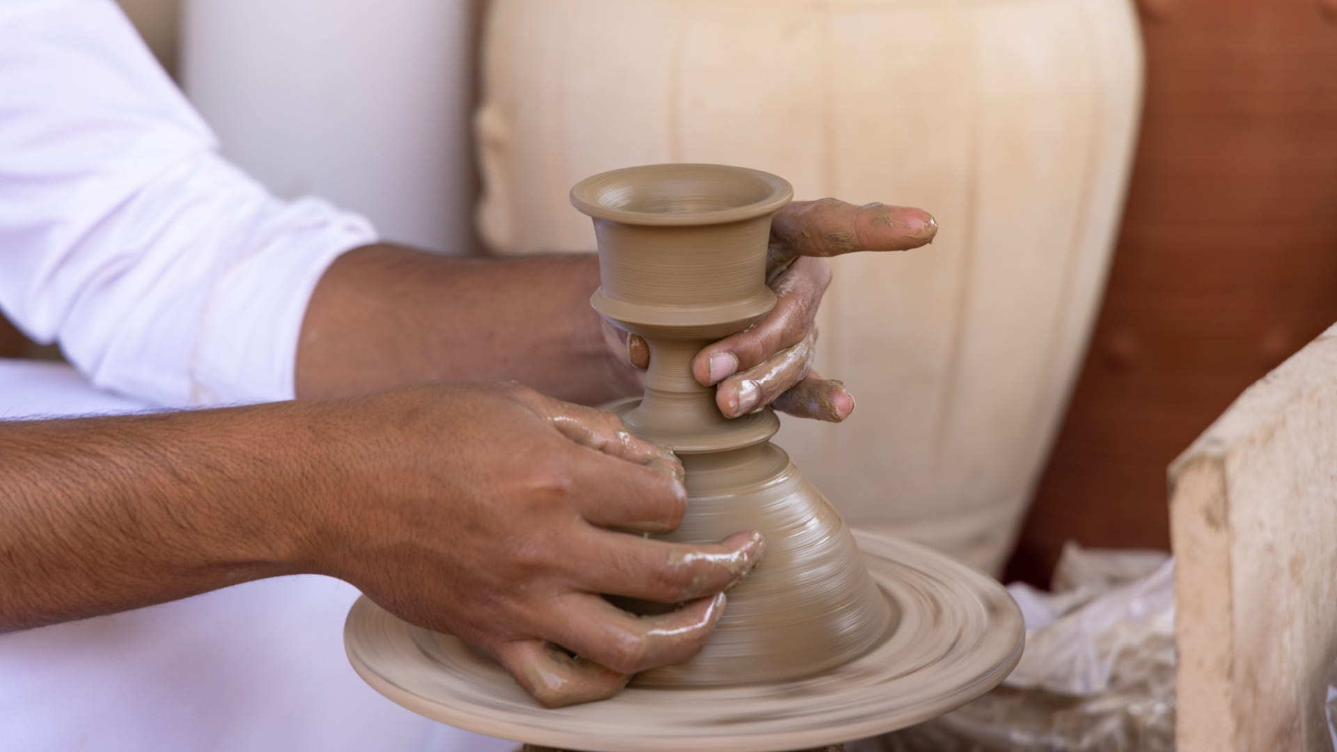 تُعدّ صناعة الفخّار واحدةً من أقدم الحِرف التقليدية التي عرفها الإنسان عبر التاريخ، وقد استُخدمت كثيراً في الحياةِ اليومية؛ فحُضّرت من خلالها الأواني، والأدوات الخاصّة بالطّعام، والشّراب، والسوائل الأخرى على اختلافها، أمّا في العصر الحالي؛ فهي لا تزال تحتفظ بطابعٍ تراثيّ وجماليّ متميّز؛ فضلاً عن استخدامها في بعض الصّناعات الحديثة سواء في مجال التصميم، أو في المجال العمليّ مثل؛ تصنيع أواني الطهي، كلّ هذا يجعلها حاضرةً بشكلٍ بارزٍ ضمن ملتقى الشّارقة للحرف التقليدية، وبما يُشجّع على ممارستها بين الحرفيين، والترويج لها على أنها منتج يدويّ سياحيّ.