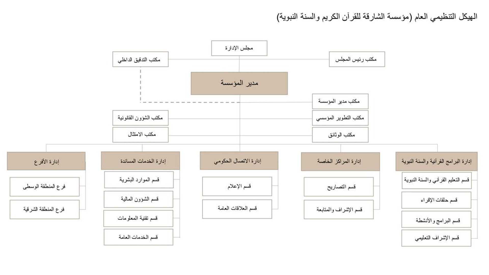 1. الهيكل التنظيمي التفصيلي لمؤسسة الشارقة للقرآن الكريم والسنة النبوية، والقرارات اللازمة لتنفيذ هذا المرسوم بما في ذلك اعتماد التوصيف الوظيفي لمهام الوحدات التنظيمية في المؤسسة بما يتفق مع اختصاصاتها.