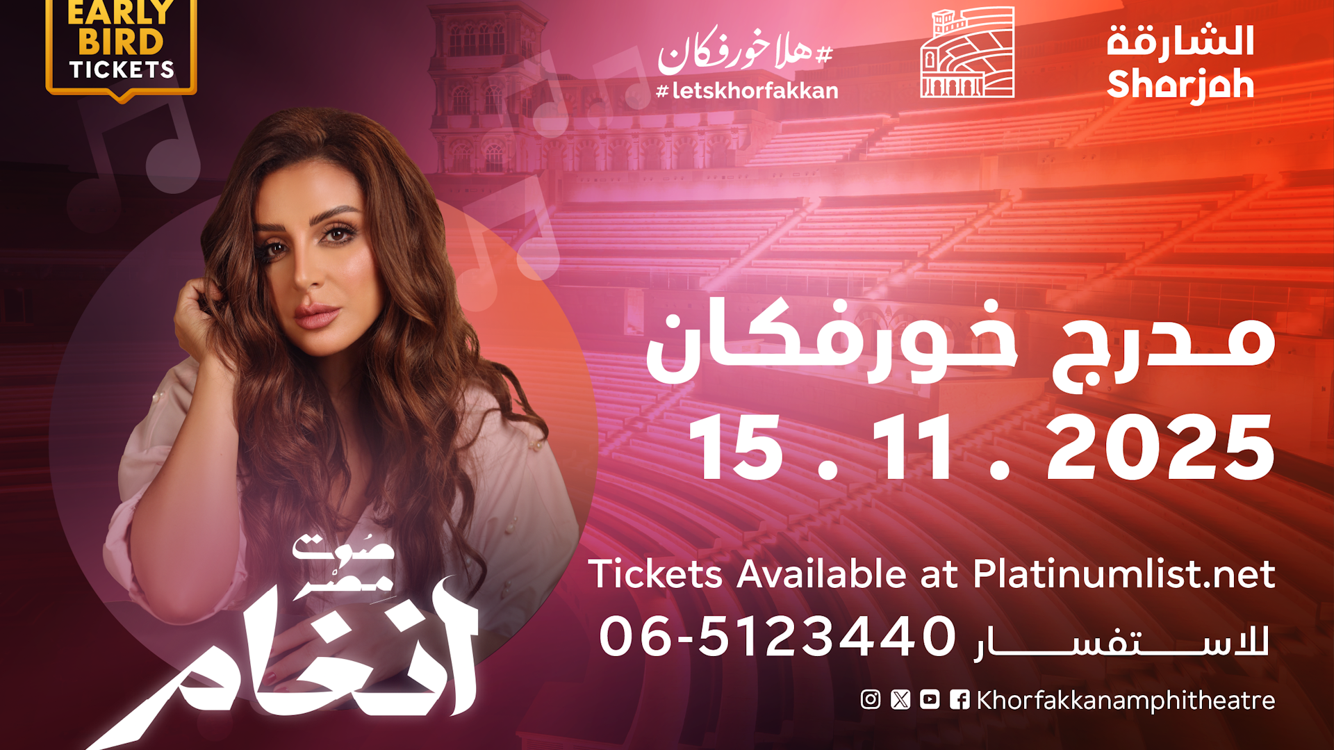 وفي الوقت الذي يتميز فيه مدرج خورفكان، المطل على الساحل الشرقي للدولة بفرادة تمزج بين التاريخ والحداثة، يضيء حفل أنغام بليلة من الفن الرفيع، يتناغم فيها جمال المكان مع سحر صوتها الشجي، ليمنح الحاضرين تجربة موسيقية لا تُنسى.