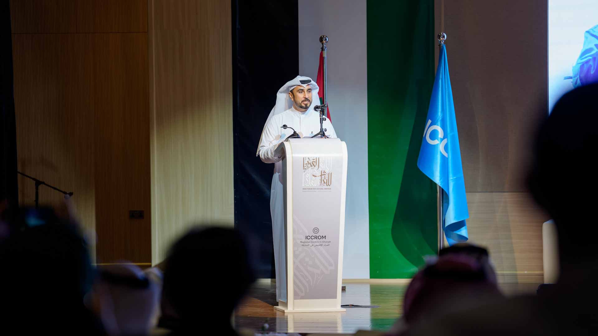 وتناول المسلّم أهمية التعاون المتميز بين المعهد ومركز إيكروم الإقليمي في الشارقة، الذي أصبح نموذجاً إقليمياً للتعامل مع التحديات الملحة في صون التراث، مشيراً إلى أن الحفاظ على التراث لا ينفصل عن الابتكار؛ فالابتكار المتحفي ليس ترفاً، بل هو ضرورة تُمكِّننا من إعادة تقديم تراثنا للأجيال الصاعدة وللعالم بأسره بلغة معاصرة يفهمها ويقترب منها، دون أن نفقد أصالته أو قيمته.