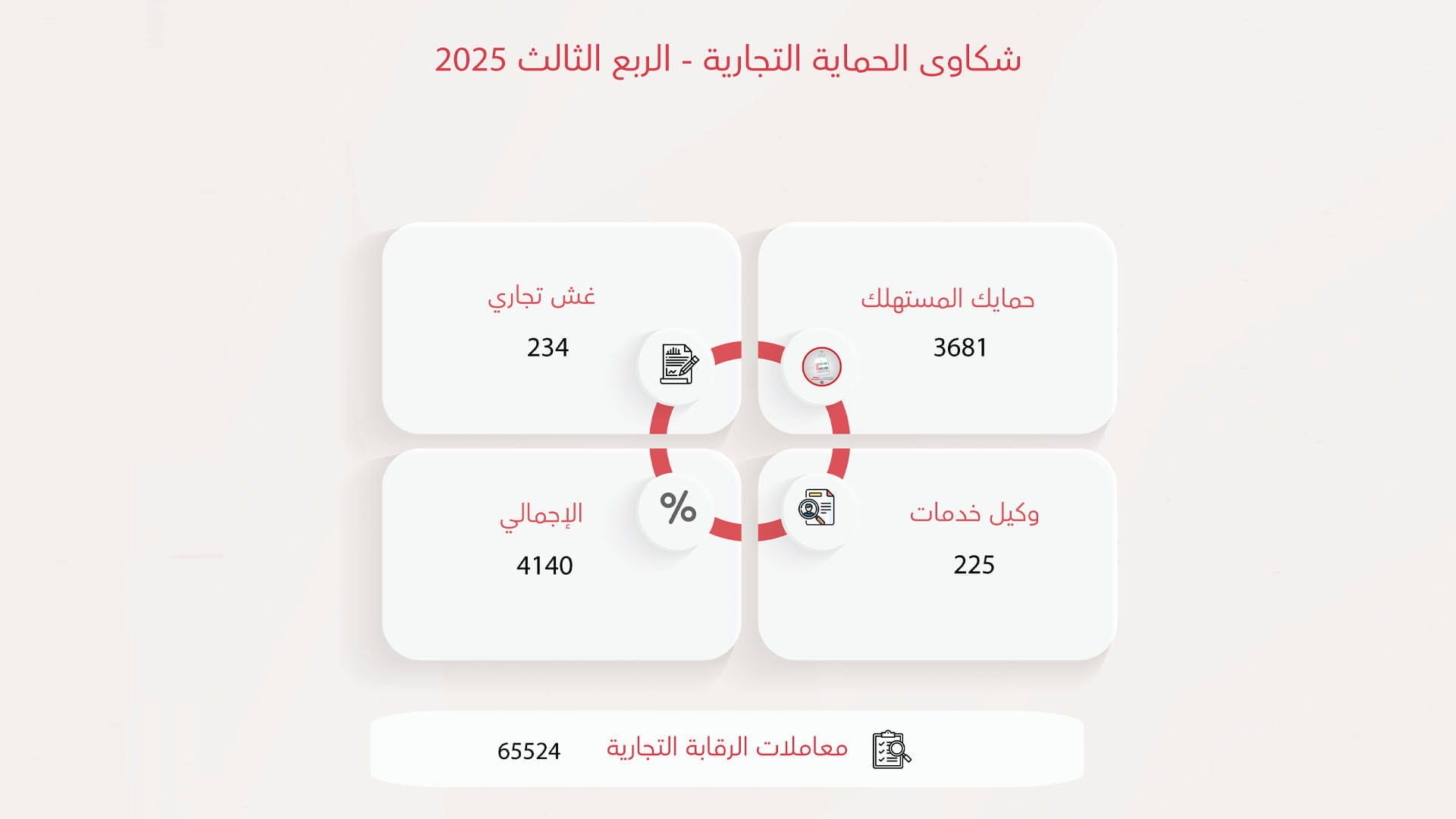 وفي الحديث عن الحماية التجارية، فقد بلغ إجمالي شكاوى الحماية التجارية 4140 شكوى في الربع الثالث من العام الحالي، وكان النصيب الأكبر لشكاوى حماية المستهلك حيث بلغت 3681 شكوى، تليها شكاوى الغش التجاري 234 شكوى، فيما بلغ عدد شكاوى وكيل خدمات 225 شكوى.