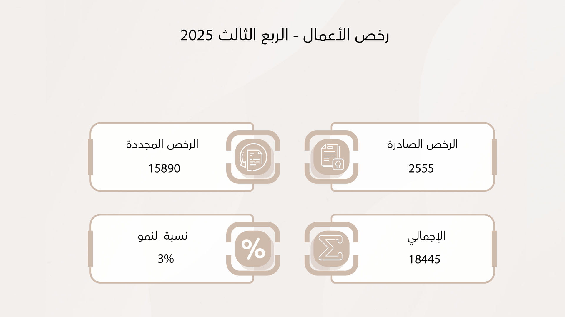 وأشارت البيانات الصادرة لوجود ارتفاع ملحوظ في معدل نمو الرخص الصادرة حسب نوع الرخصة خلال الربع الثالث من العام 2025، حيث بلغت الرخص التجارية الصدارة بإجمالي وصل إلى 1500 رخصة، تليها الرخص المهنية بعدد 740 رخصة، ومن ثم الرخص الصناعية والتي وصلت إلى 135 رخصة، فيما حلت رخص المتاجرة الإلكترونية رابعاً بإجمالي 97 رخصة، في حين جاءت رخص اعتماد خامساً بـ 83 رخصة.
