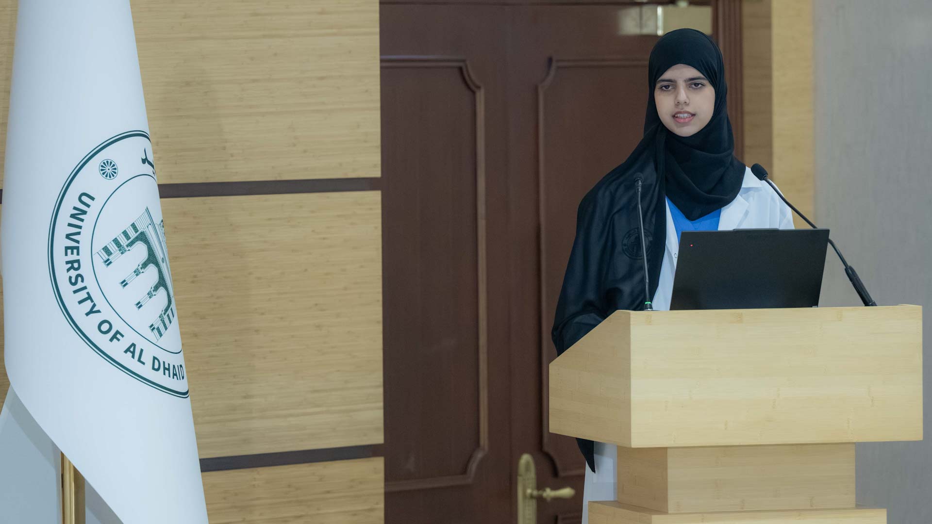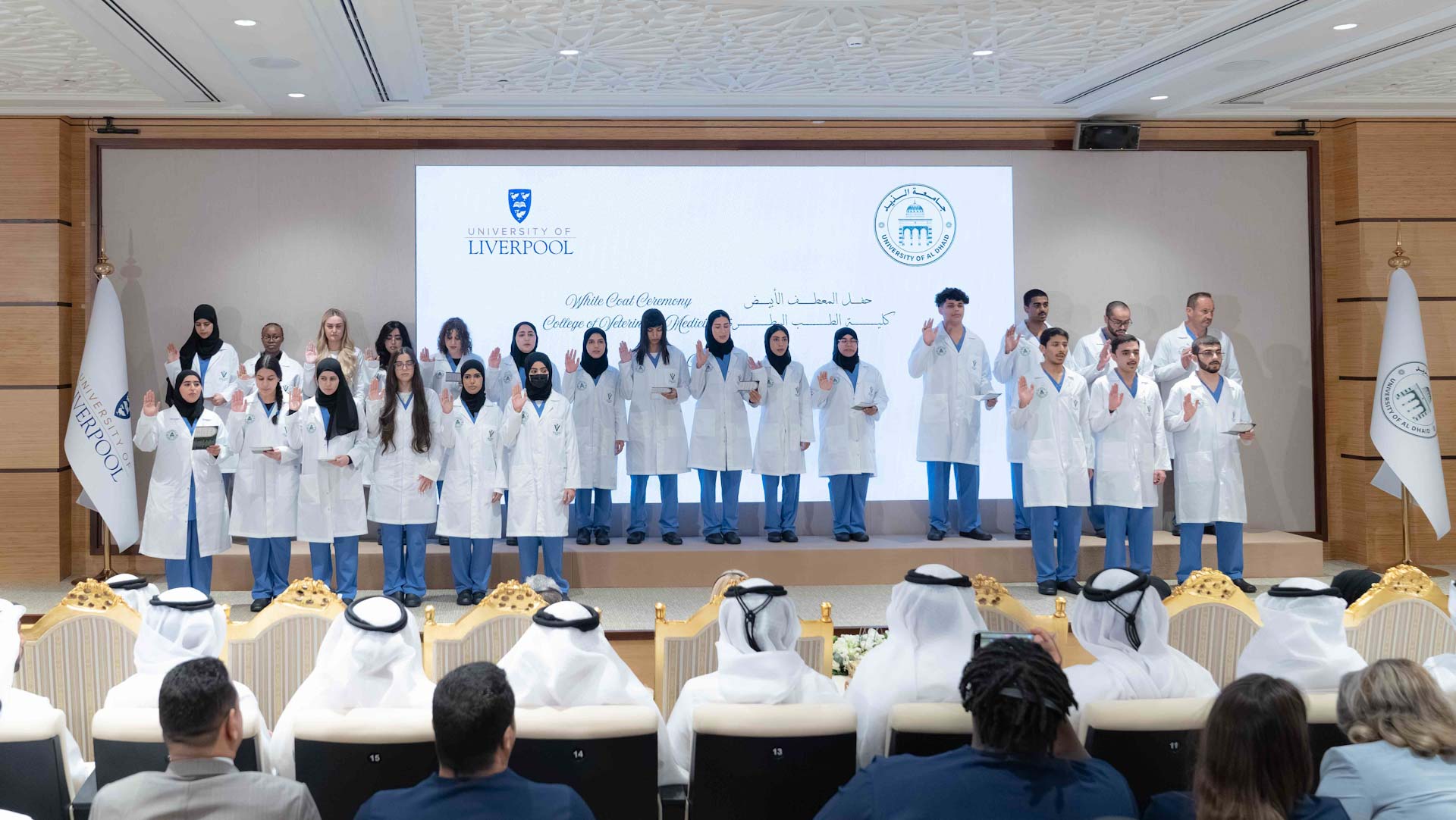 وكان الحفل الذي أقيم على مسرح جامعة الذيد قد استهل بالسلام الوطني لدولة الإمارات العربية المتحدة، ألقت بعدها الطالبة غلا إبراهيم الحوسني كلمة نيابة عن زملائها وزميلاتها في كلية الطب البيطري عبّرت فيها عن شكرهم وامتنانهم لصاحب السمو رئيس جامعة الذيد على دعمه ورعايته الدائمة، مؤكدةً أن هذا اليوم يشكل نقطة انطلاق جديدة نحو مستقبل مهني يقوم على المسؤولية والعطاء.