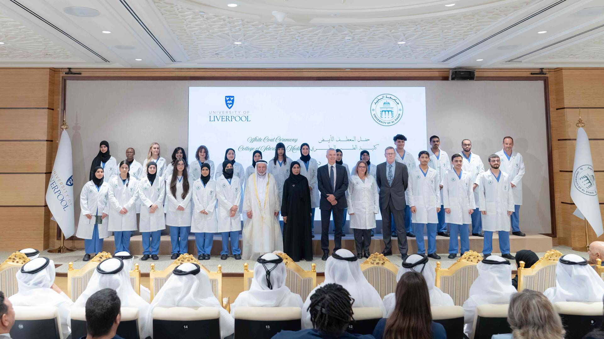 واختتم حفل المعطف الأبيض بالتقاط صاحب السمو رئيس جامعة الذيد صورة جماعية مع الطلاب والطالبات في كلية الطب البيطري، معبّرين فيها عن فخرهم بهذا اليوم الذي يحتفي بانطلاقة الطلبة نحو مرحلة جديدة من مسيرتهم العلمية والمهنية، مرحلة تحمل في طيّاتها رسالة الرحمة والعلم والعطاء.