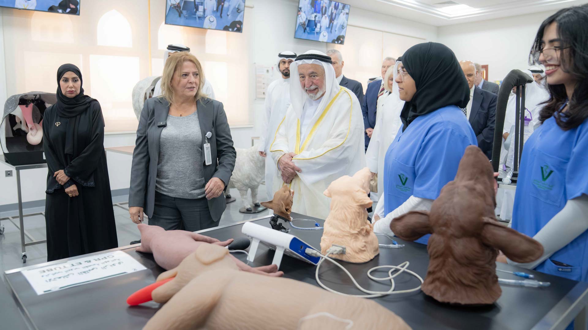 واستمع سموه إلى شرح عن مختبر المحاكاة والتشخيص وآلية عمله من حيث طرق التعامل مع الحيوانات وعلاجها، والإنعاش القلبي الرئوي وتركيب أنبوبة القصبة الهوائية، مشاهداً سموه الأدوات الجراحية وربط العُقد المستخدمة في جراحات الحيوانات، والوضعيات الصحيحة للأشعة السينية وجرعات الأدوية وطرق الحقن.