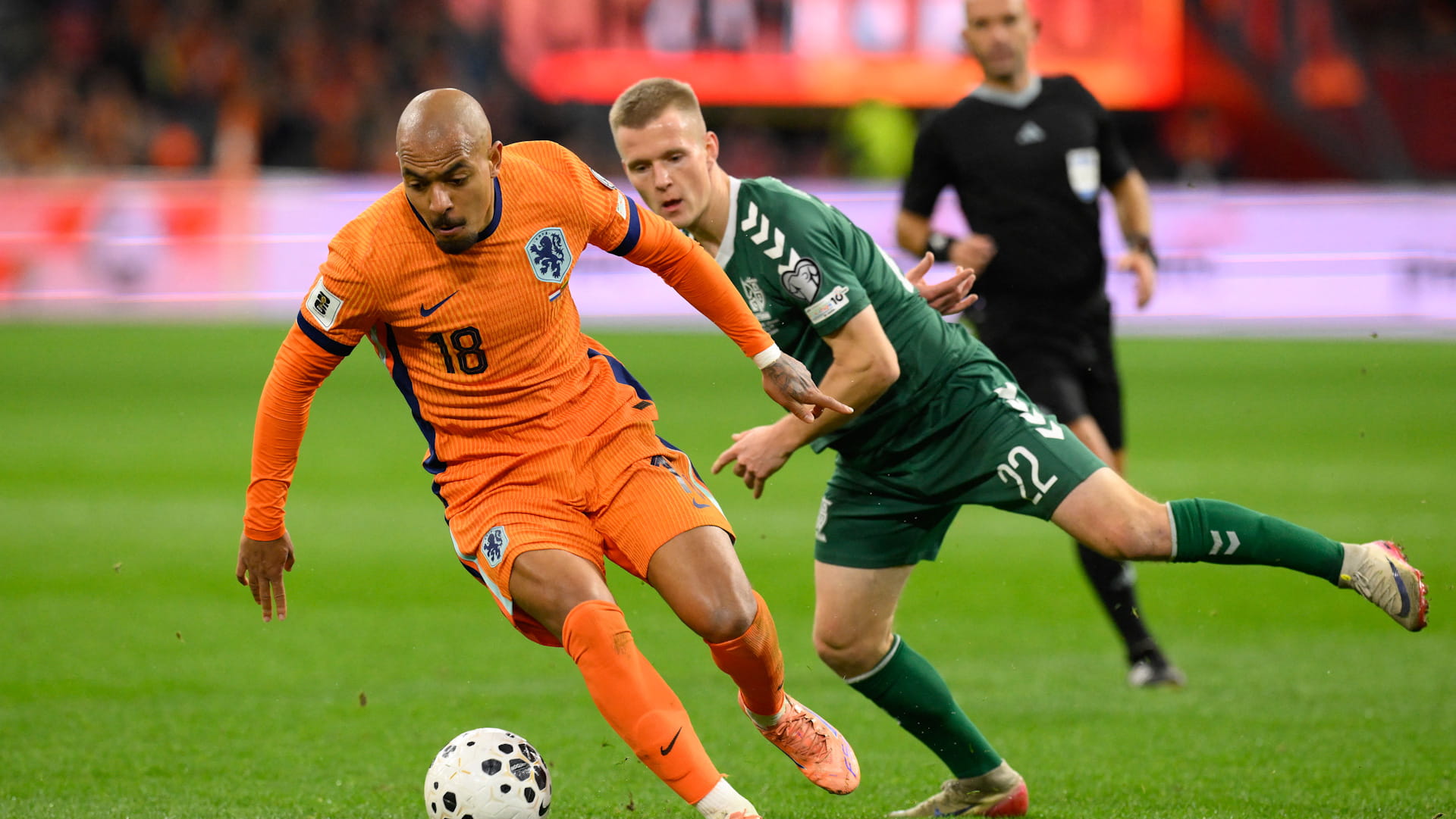 وأثمر ضغط هولندا هدفا عندما قطع دي يونغ كرة للمدافع أرتيميوس توتيسكيناس عند مشارف المنطقة وهيأها إلى رايندرس المتوغل داخلها، فسددها بيمناه على يمين الحارس الليتواني (16).