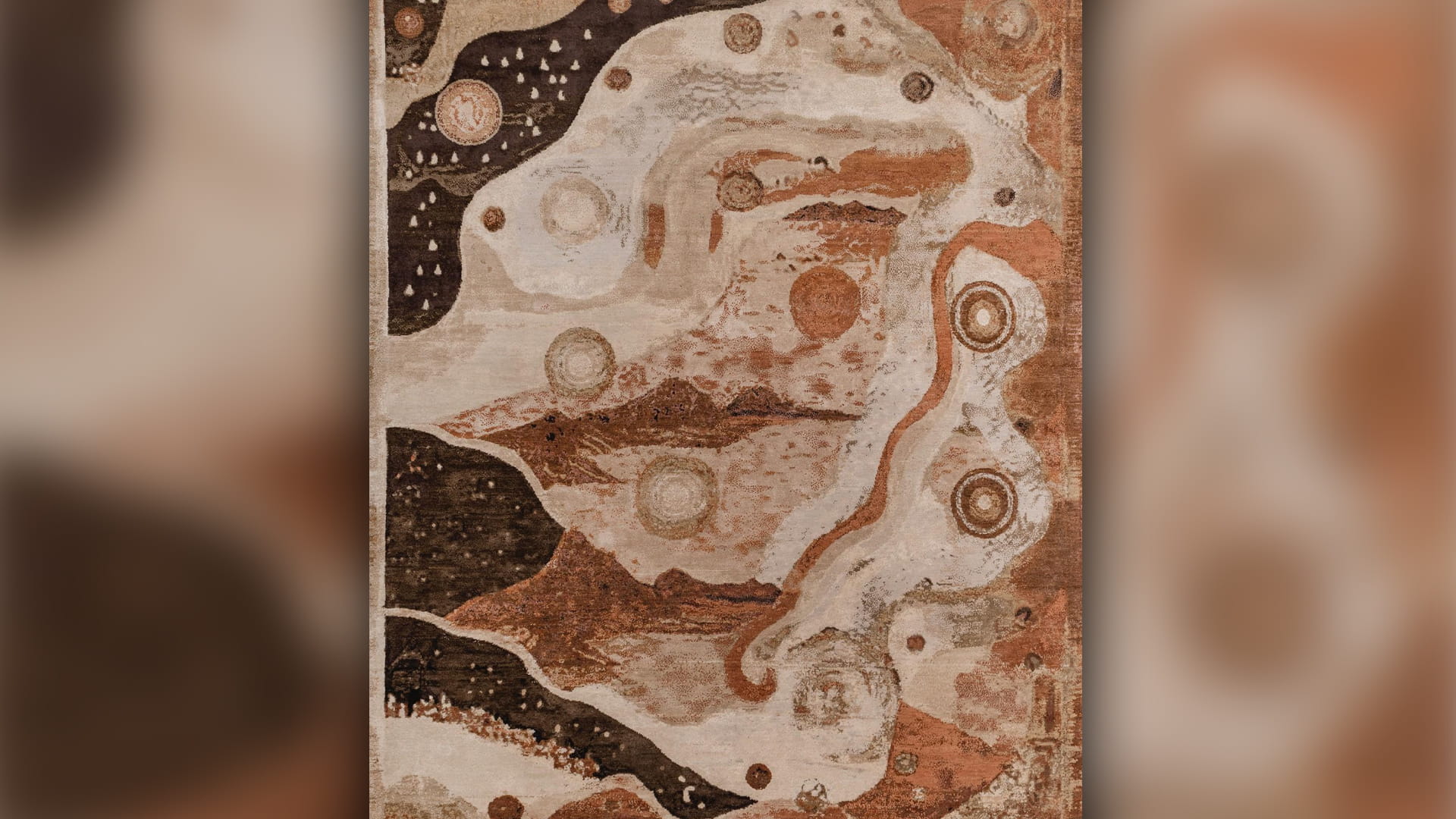 يستحضر هذا العمل لحظة التقاء الأرض بالسماء في مشهدٍ مهيب، كاشفاً عن أرضٍ يغمرها ضوء الليل الهادئ. تنساب عبر نسيجه دوّاماتٌ من الحركة والطاقة، فتوقظ أنماطاً تستدعي رقصة النجوم الحالمة، وتعيد إلى الذاكرة صعود التلال وهبوطها، وطيّات الوديان المستترة وحدودها المطمورة تحت الزمن. هنا تتآكل الجبال وتنكشف طبقاتها، وتتراجع البحار عن امتدادها القديم، وتنسحب الغابات وكأنها تفسح الطريق لبداية أخرى. ومع ذلك، يبقى كل خيط في السجادة نابضاً بالحياة، يوحي بدورة لا تنقطع. ومع كل نظرة جديدة، تتجلّى لحظة كشف صامتة— سجلٌّ للبدايات والعبور والشهادة— تجسّد أرضاً تقف عند مفترق الزوال والخلود في آنٍ واحد، حيّةً في الذاكرة كما في الخيال.
