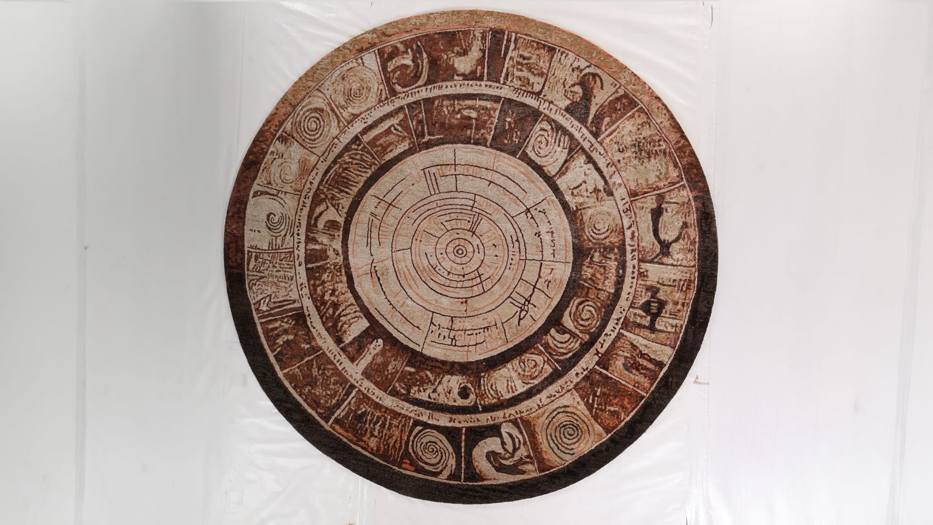 يتجسّد مدّ الحياة وجزرها في ذاكرة الإنسان، وفي كل ما يبقى قائماً شاهداً على ما انقضى. وفي قلب هذه السجادة، تظهر حلقاتٌ دائرية متتابعة تشبه ما نراه في المقطع العرضي لجذع شجرة؛ كل حلقة منها تُسجّل عاماً من النمو، وتجربةً من التحدّي، وأثراً من الصمود. ومن حولها، تمتد نطاقاتٌ مروحيةٌ تتسع تدريجياً نحو الخارج، كأنها بوصلة تشير إلى الجهات الأربع، محمّلةً برموز ودوائر وزخارف متموّجة تستعيد دورات الطبيعة وتعاقب الأحداث، وتروي حكايةً متراكبة للأرض وكل ما مرّ عليها. وتنساب فوق النسيج ملمساتٌ دقيقة تردّد في سكون إيقاعات الطبيعة وطاقتها، فتحوّل السجادة إلى سجلّ بصريّ يحتفظ بأثر الزمن المتحرّك. يصبح هذا العمل بذلك لحظة تأمّل في دورات الكون وفي الأنماط الكبرى التي تنسج الحياة، داعياً المتأمّل إلى الإصغاء لنبض الأرض وشهادتها الصامتة على مرور الزمن وتحولاته.