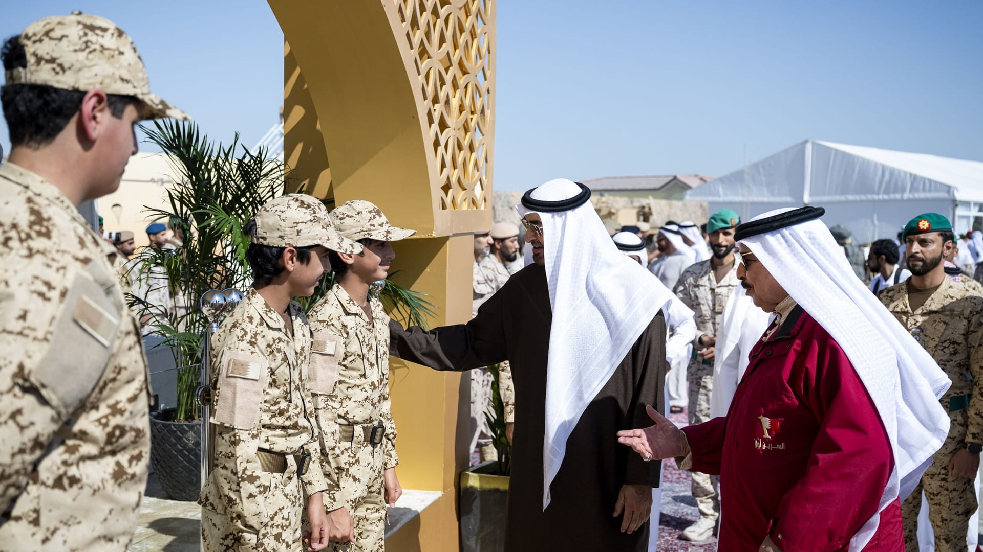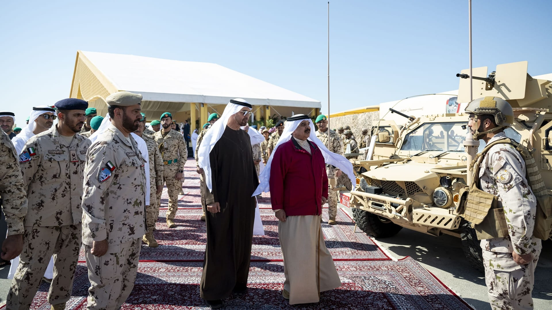 محمد بن زايد آل نهيان والملك حمد بن عيسى بجولة في مواقع التدريب حيث صافحا كبار ضباط القوات المسلحة من المشاركين في التمرين العسكري من الجانبين، واستمعا إلى إيجاز حول فعاليات التمرين ومحتوى المعرض المصاحب له.