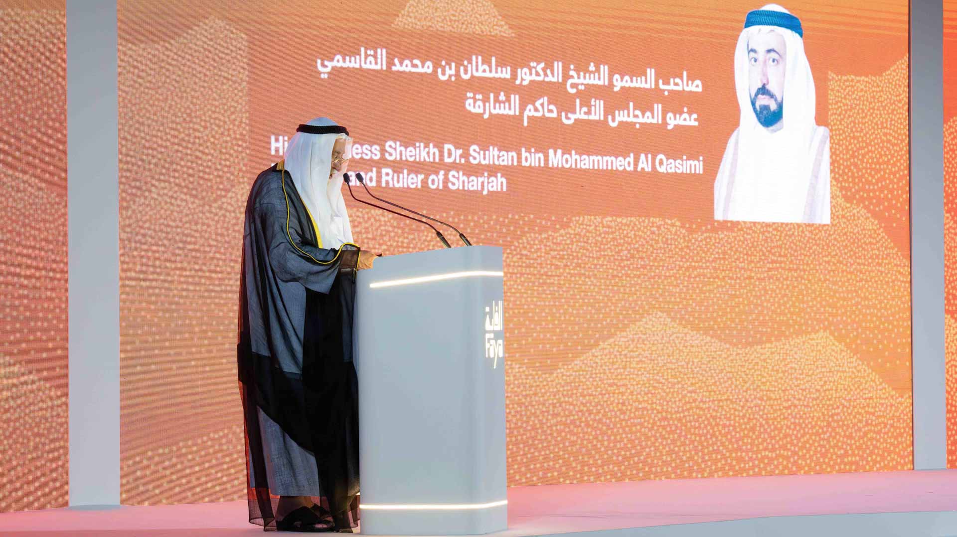 وتحدث صاحب السمو حاكم الشارقة عن جهود إمارة الشارقة في دعم المشاريع الثقافية، قائلاً: "من هنا، يحتل التراث موقعاً مركزياً في المشروع الثقافي لإمارة الشارقة، لأن التراث يمنح الثقافة جذورها التي تستند إليها، وكذلك يضعها في السياق الذي تتشكل من خلاله الصورة المتكاملة للإنسان والمجتمعات في هذه المنطقة، يكشف البحث التاريخي في الفاية تاريخ الإنسان، وهو يتعلم معنى الجماعة، ويؤسس للتعاون، ويُنظّم العمل، ويقسم الموارد، وهذه المقومات كلها تُشكّل الركائز الأساسية للبنية الاجتماعية التي امتد أثرها إلى العصور اللاحقة".
