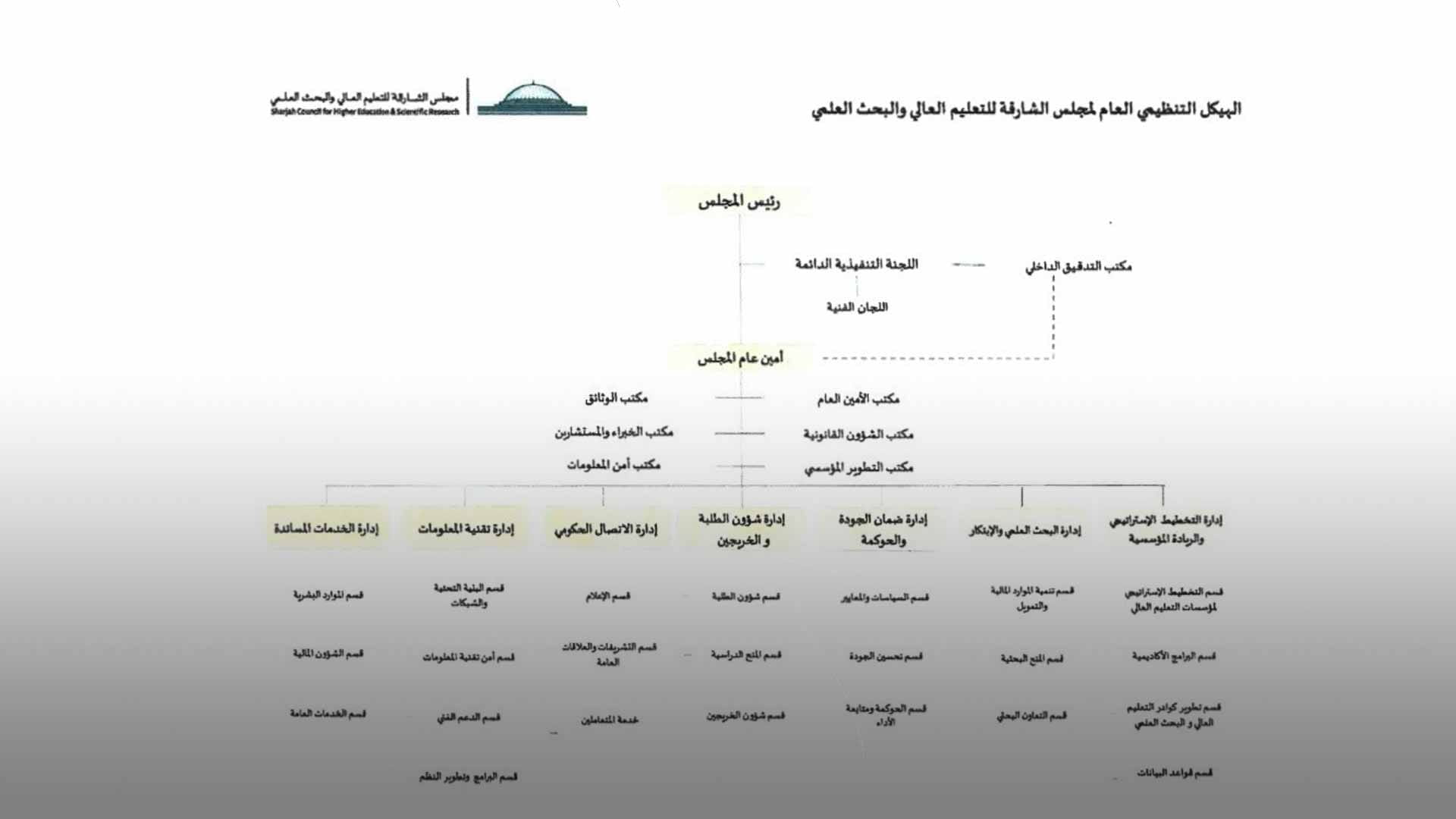 ونص المرسوم على أن يُعتمد الهيكل التنظيمي العام لمجلس الشارقة للتعليم العالي والبحث العلمي، ويُصدر المجلس التنفيذي بقراراتٍ منه الهيكل التنظيمي التفصيلي لمجلس الشارقة للتعليم العالي والبحث العلمي، والقرارات اللازمة لتنفيذ هذا المرسوم بما في ذلك اعتماد التوصيف الوظيفي لمهام الوحدات التنظيمية في المجلس بما يتفق مع اختصاصاته، واستحداث أو دمج أو إلغاء أي وحدات تنظيمية تتبع الإدارات المُدرجة ضمن الهيكل التنظيمي العام.