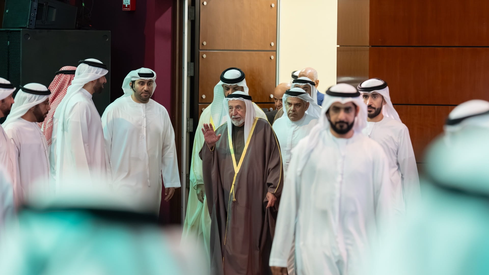 وتناول عجمي جهود صاحب السمو حاكم الشارقة في العناية المتكاملة للغة العربية، قائلاً بلسان اللغة العربية: "أنا العربيةُ جئتُ أُثني شاكرةً من خدمَ الحرفَ إخلاصاً وما ابتغيا، سلطانُ يا ابن القواسمِ يا سندي يا من حملت لواء الضَادِ مُتسعاً ".