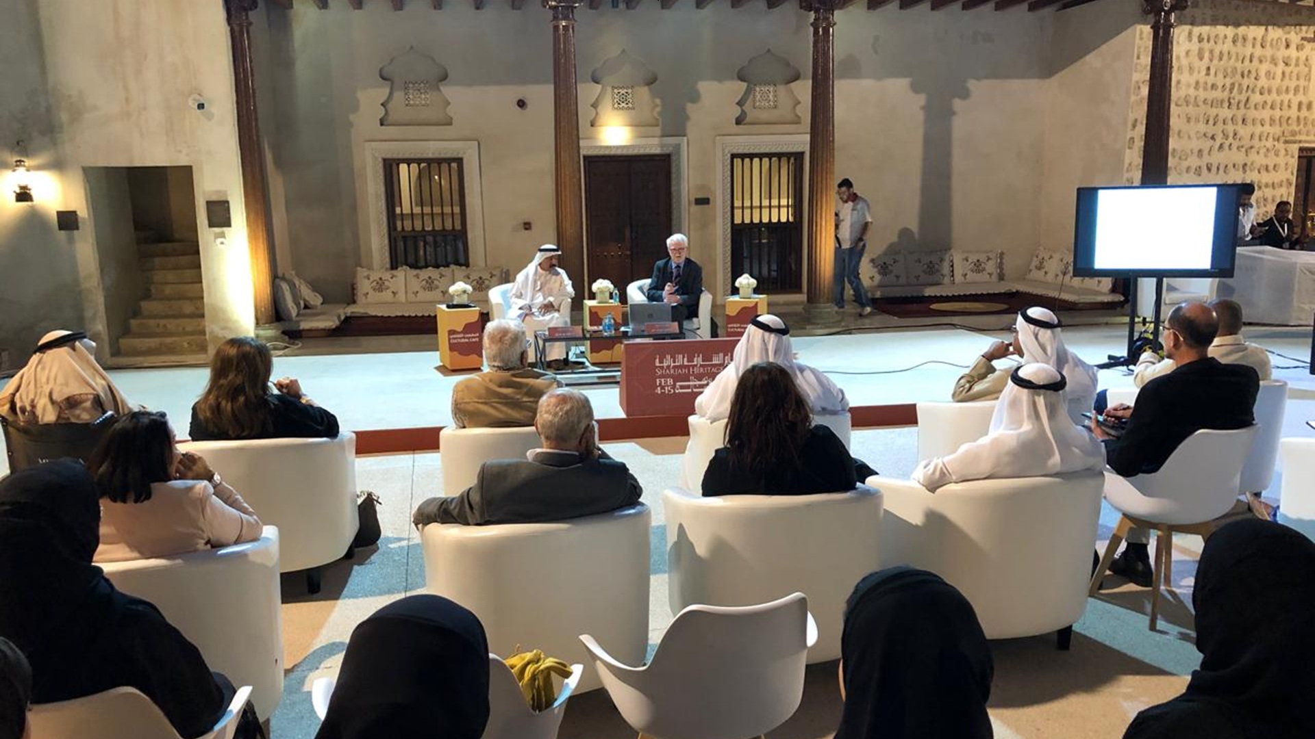 شهدت فعاليات اليوم الثاني من "أيام الشارقة التراثية" حراكاً فكرياً وثقافياً متنوعاً، حيث انطلقت في بيت النابودة أولى جلسات ملتقى "دلّوني على السوق" بندوة بعنوان "الأسواق والتجارة وألفاظ البيع والشراء في اللغات السامية القديمة"، بمشاركة البروفيسور جون في هيلي والدكتور حمد بن صراي، وذلك بالتزامن مع ندوة متخصصة في مركز التراث العربي تناولت ملف "الكحل العربي" بوصفه عنصراً من عناصر التراث الثقافي غير المادي.