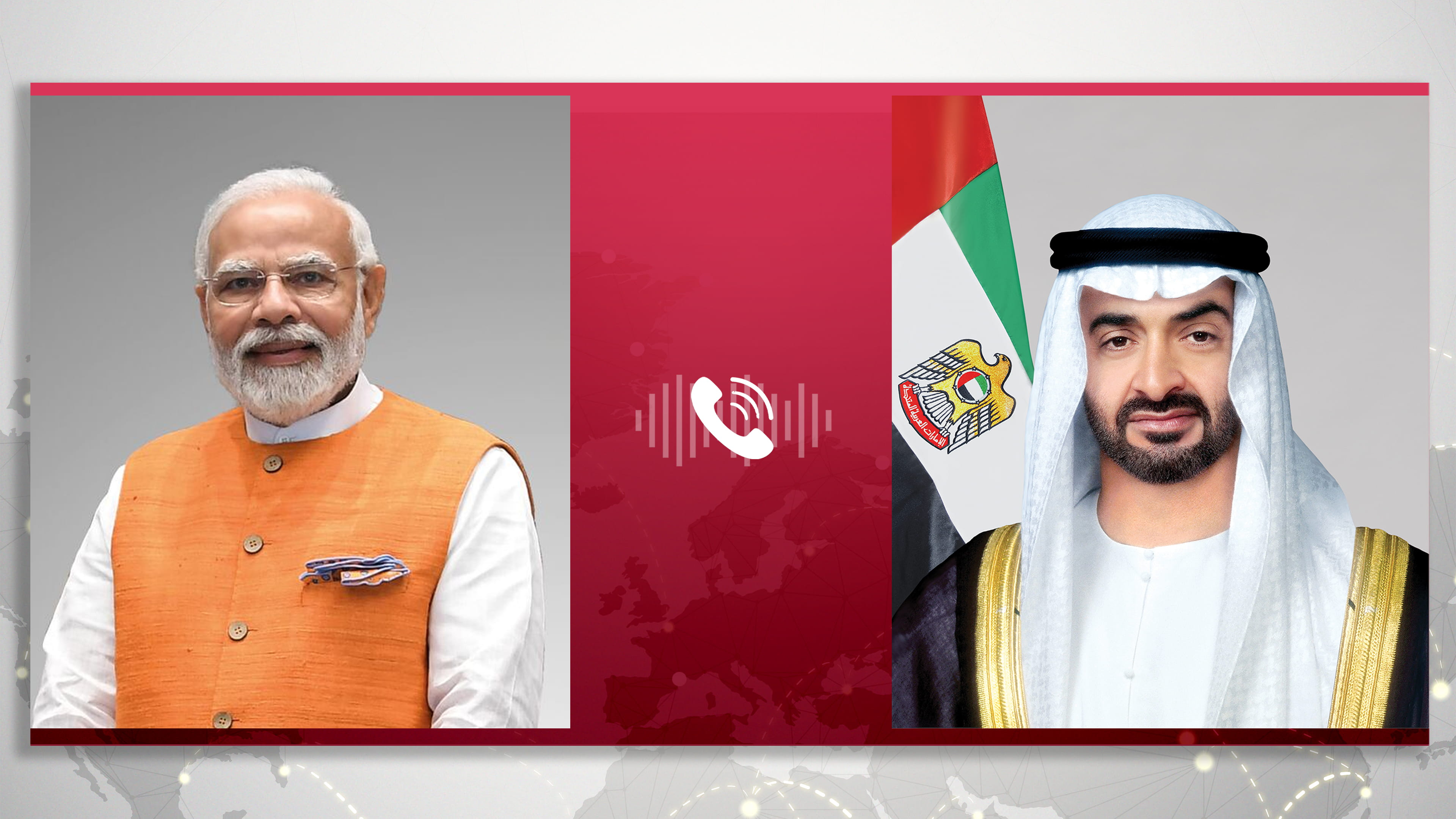 محمد بن زايد آل نهيان رئيس الدولة "حفظه الله" خلال اتصال هاتفي تلقاه من دولة ناريندرا مودي رئيس وزراء جمهورية الهند، تطورات الأوضاع في المنطقة إثر الأعمال العسكرية المتصاعدة وما تنطوي عليه من تداعيات خطيرة على الأمن والاستقرار الإقليمي والدولي.