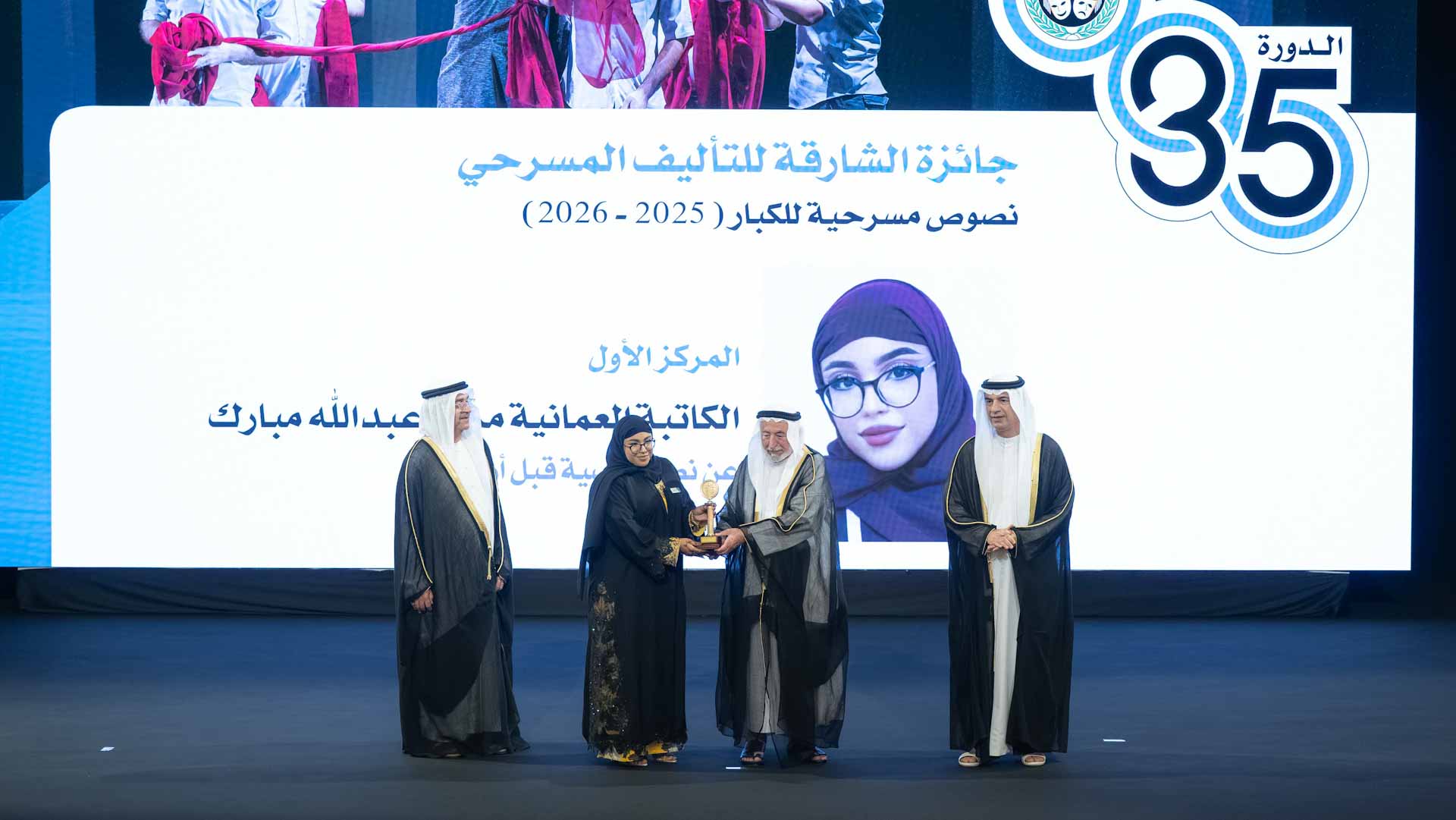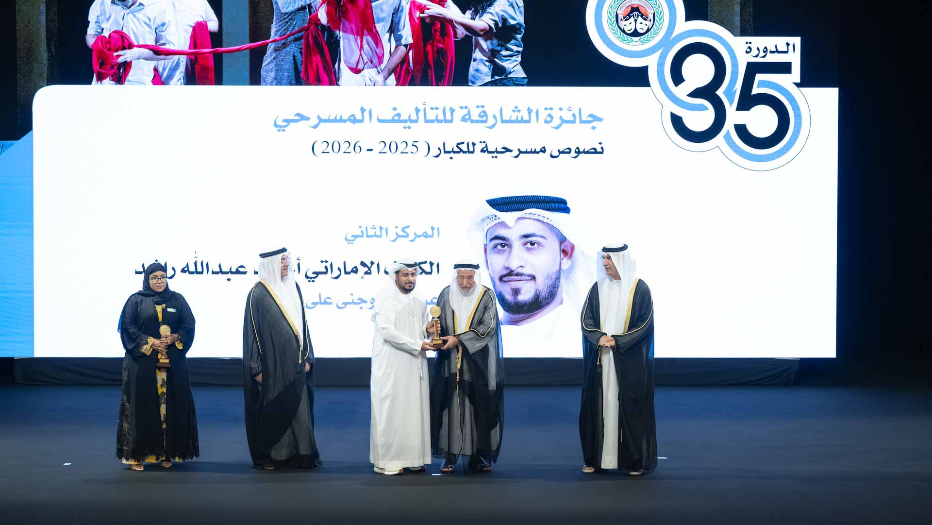 وتفضل صاحب السمو حاكم الشارقة بتكريم مخرجة مسرحية "الهاربات" من دولة تونس وفاء الطبوبي، بجائزة الشيخ الدكتور سلطان بن محمد القاسمي لأفضل عمل مسرحي عربي 2025، والفائزين بجائزة الشارقة للتأليف المسرحي، حيث نالت المركز الأول مريم عبد الله مبارك من سلطنة عُمان عن نصها "وصية قبل أن أولد"، وجاء في المركز الثاني أحمد عبد الله راشد من الإمارات عن نصه "وجنى على نفسه"، فيما حل ثالثاً بدر الحمداني من سلطنة عُمان عن نصه "المحطة".