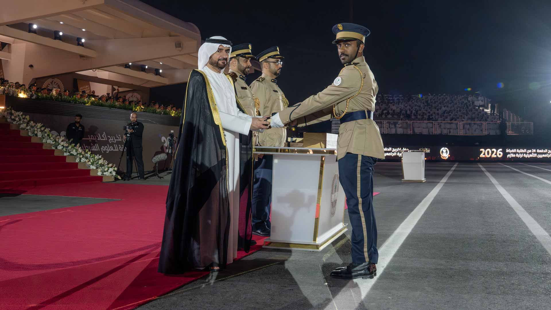 وأكد العميد العثمني أن ما تنعم به الدولة من أمن واستقرار في ظل قيادة صاحب السمو الشيخ محمد بن زايد آل نهيان، رئيس الدولة، حفظه الله، هو ثمرة رؤية قيادية راسخة، ترجمتها المؤسسات الأمنية والعسكرية أداءً متميزاً يعكس التزاماً وطنياً رفيعاً ويجسد مكانة الإمارات، كما قدم أسمى آيات الشكر والعرفان إلى صاحب السمو حاكم الشارقة، على رعايته الكريمة ودعمه المتواصل لمسيرة الأكاديمية، مشيراً إلى أن توجيهات سموه شكلت مرتكزاً أساسياً في إعداد الطلبة الضباط، عمادها التسلح بالعلم النافع، والتمسك بالدين القويم، والاعتزاز بالهوية الوطنية، والتحلي بالأخلاق التي تجعل من رجل الأمن قدوة يحتذى بها.