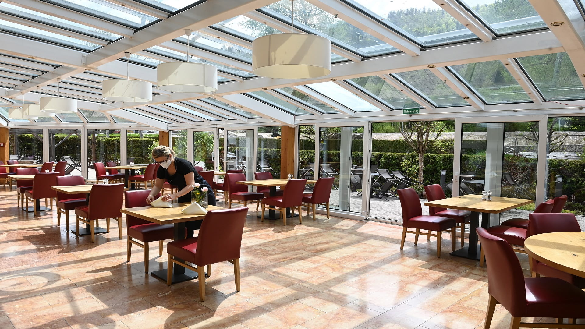 An employee works in a hotel restaurant in Garmisch-Partenkirchen, southern Germany, amid the novel coronavirus COVID-19 pandemic