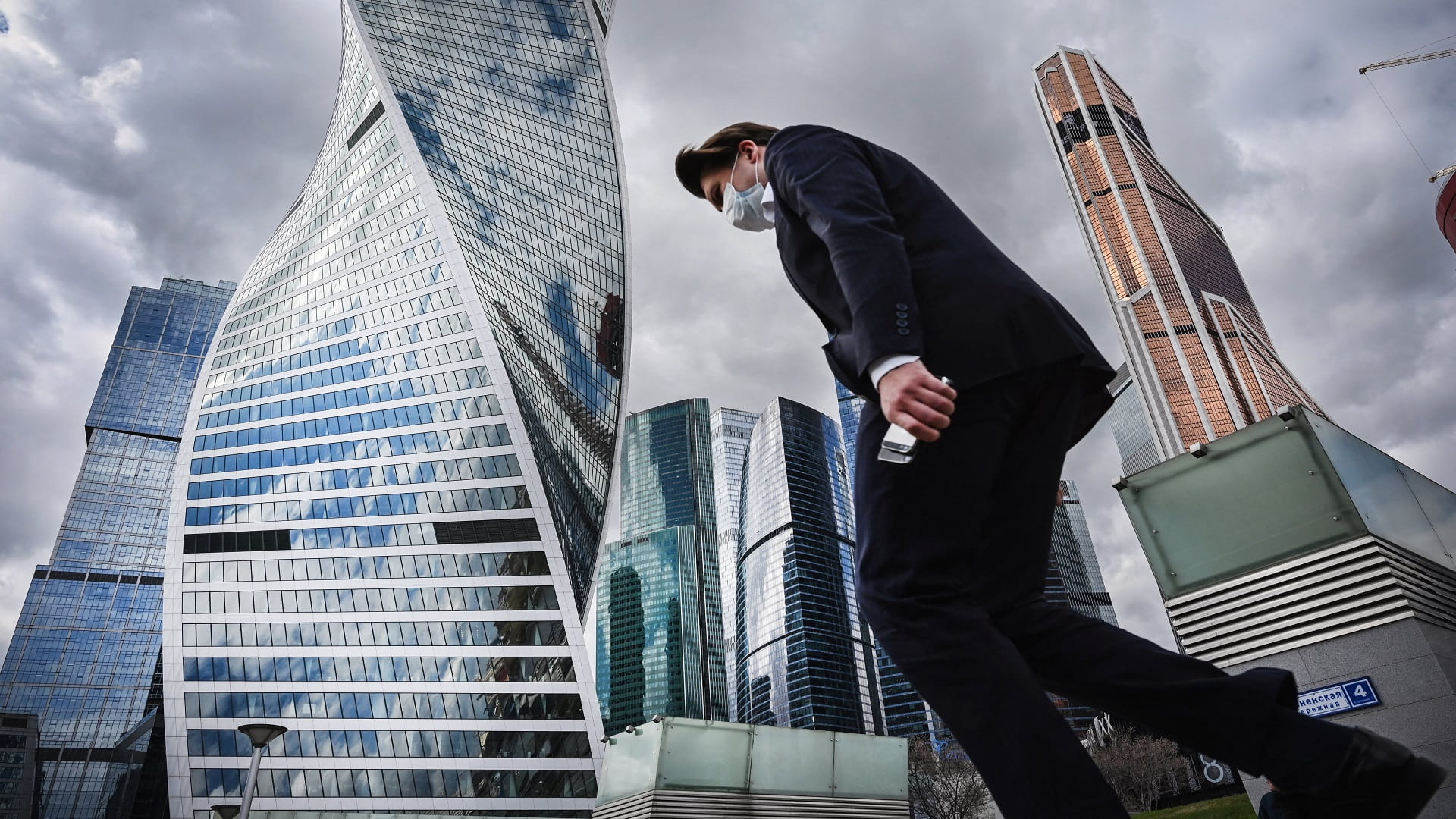 A clerk wearing a face mask walks in Moscow's International Business Centre (Moskva City) in Moscow, amid the ongoing Covid-19 pandemic