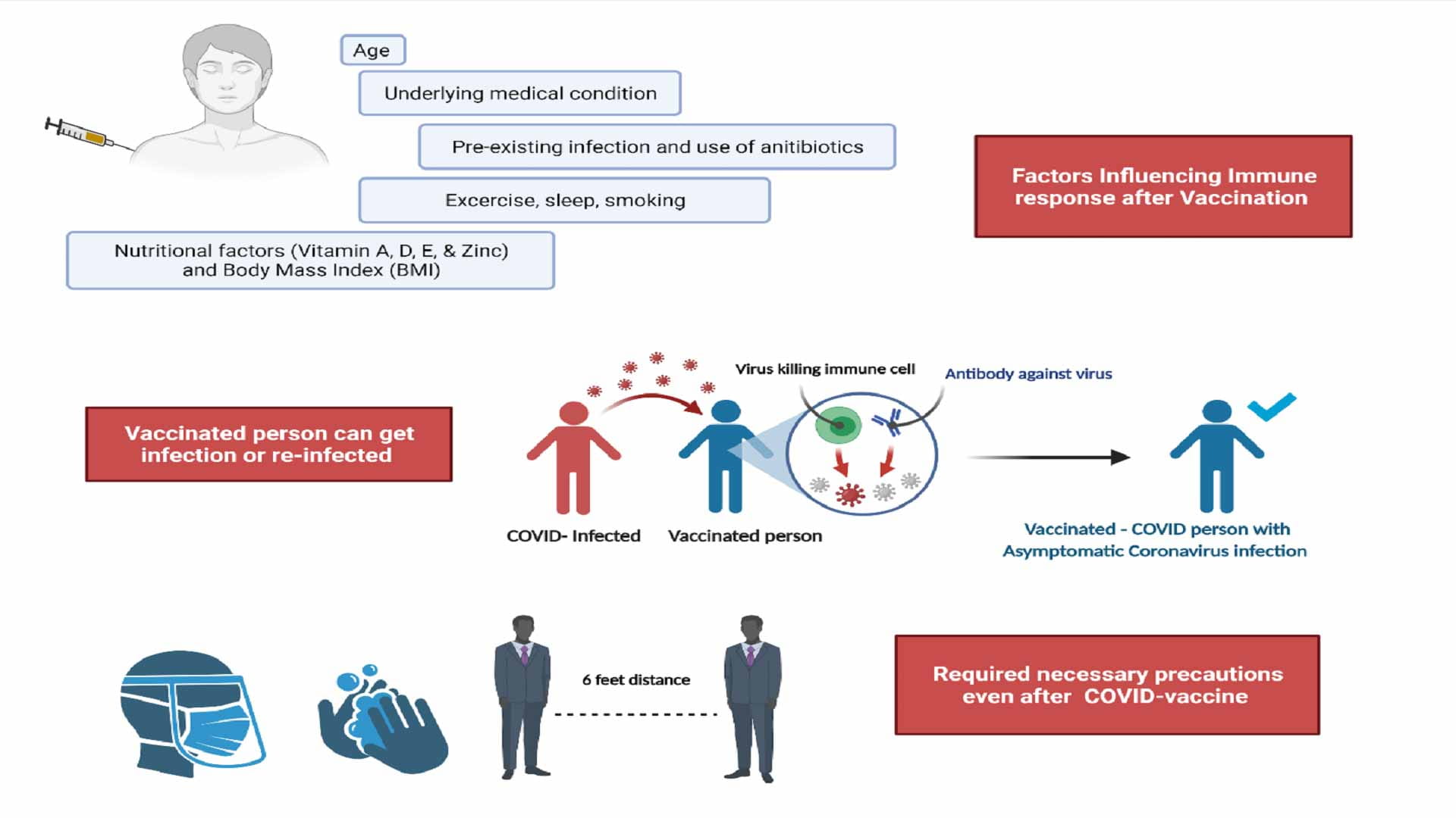 According to World Health Organization (WHO), vaccines save at least 2.5 million lives each year and are the most cost-effective life-saving medical intervention. However, in general, one must bear in mind, there are considerable differences between individuals concerning the immune response to vaccination. Regardless of the type of vaccine, many factors influence how individuals respond to vaccines. To name a few, we have age, any underlying medical conditions, any preexisting infections, use of antibiotics, exercise, sleep, smoking, body mass index, nutritional factors (Vitamin A, D, E, zinc), etc. Hence, it is not incomprehensible that substantial variation between individuals will influence the individual immune response to COVID-disease and vaccination.