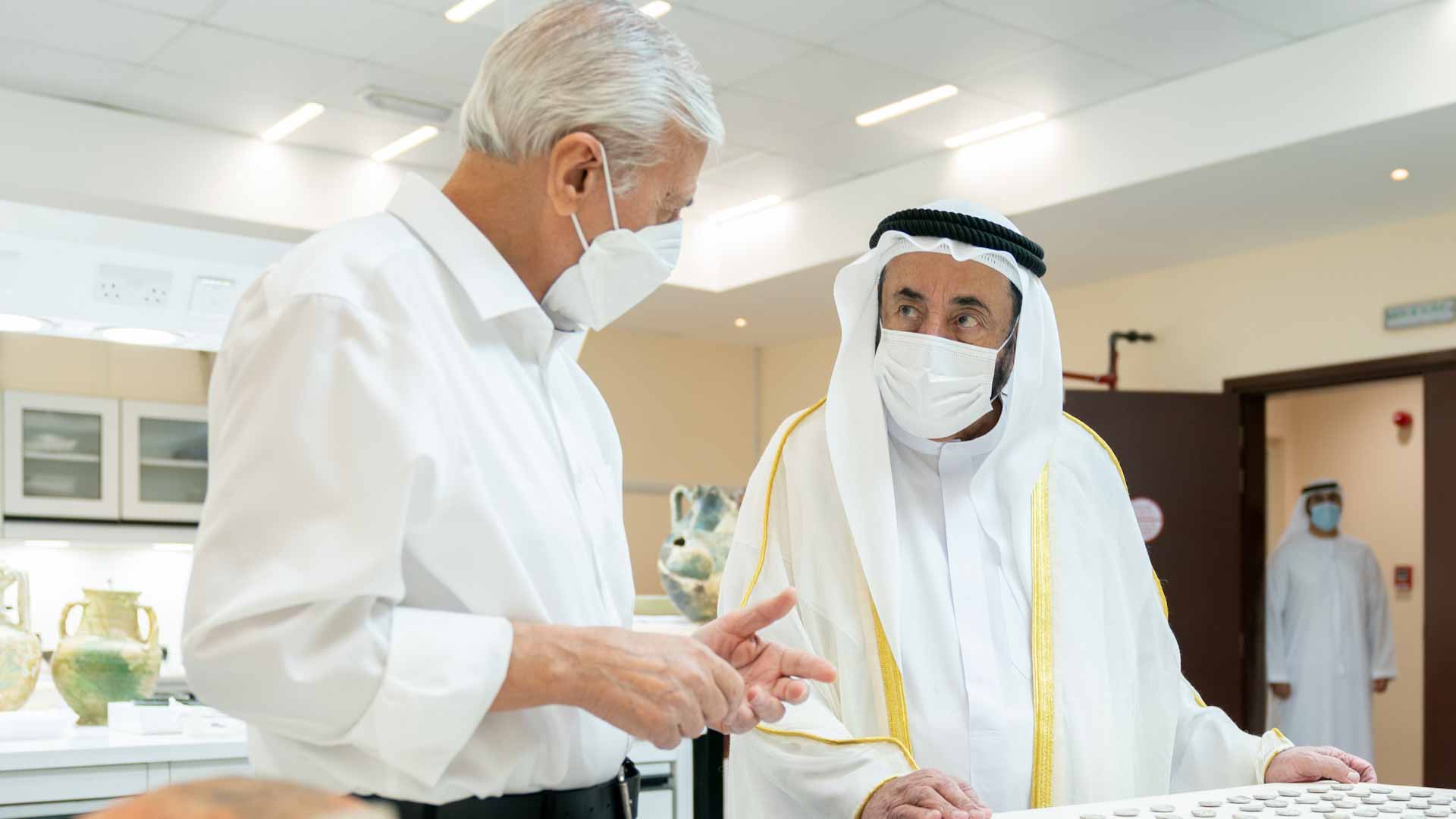His Highness listened to a detailed explanation from Sabah Aboud Jasim, Director General of Sharjah Archaeology Authority, about the components of the archaeological treasure discovered during the archaeological surveys and excavations.