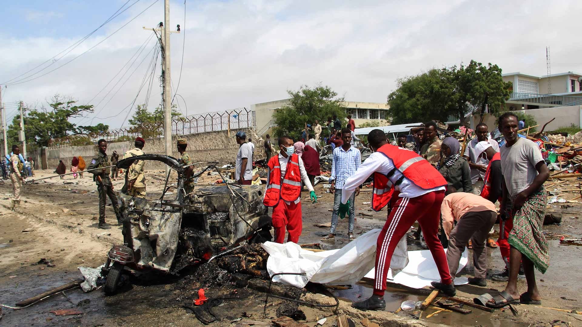 Medical workers arrive at the scene of suicide car bomb attack that targeted the city's police commissioner in Mogadishu