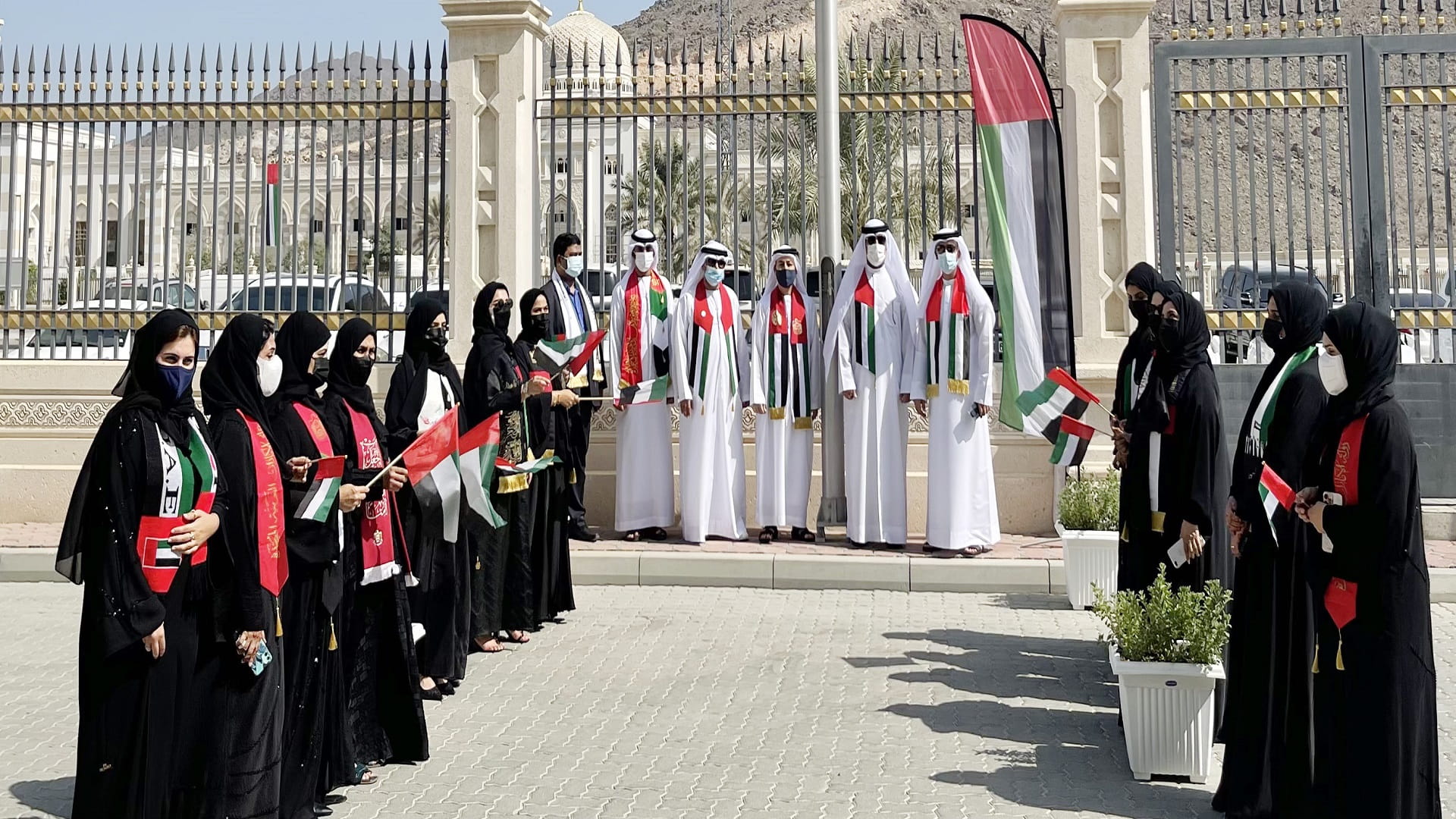 The Sharjah Government Media Bureau's (SGMB) Contact Centre commemorated Flag Day by taking all precautions to protect the health and safety of all participants. Members of Khorfakkan Municipal Council (KMC), Yusuf Shahin and Khaled Al Hosani, as well as Contact Centre staff, attended the flag-raising event.