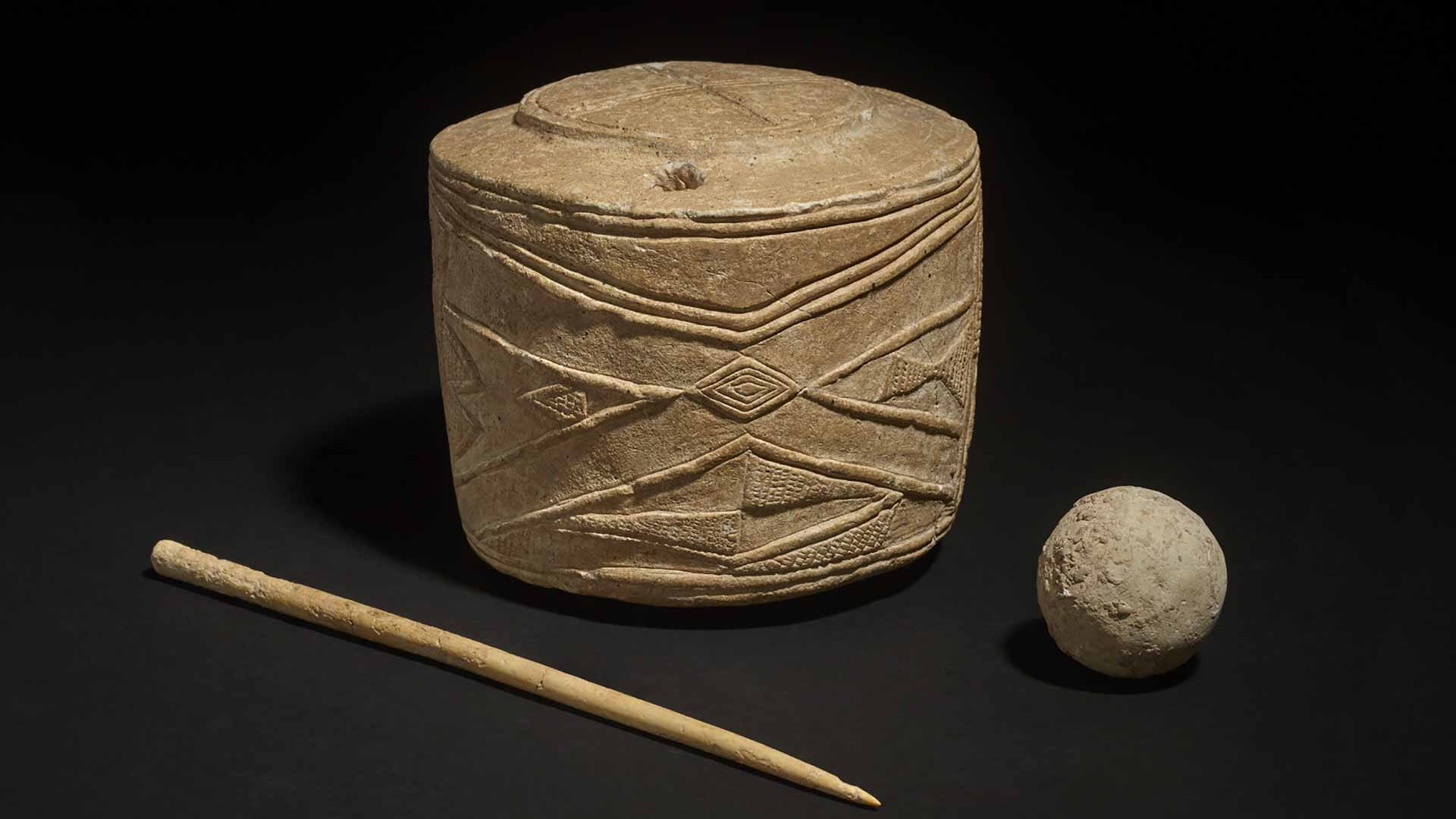 It was found alongside the grave of three children who were buried close together, touching or holding hands. The drum was placed just above the head of the eldest child, accompanied by a chalk ball and a polished bone pin.