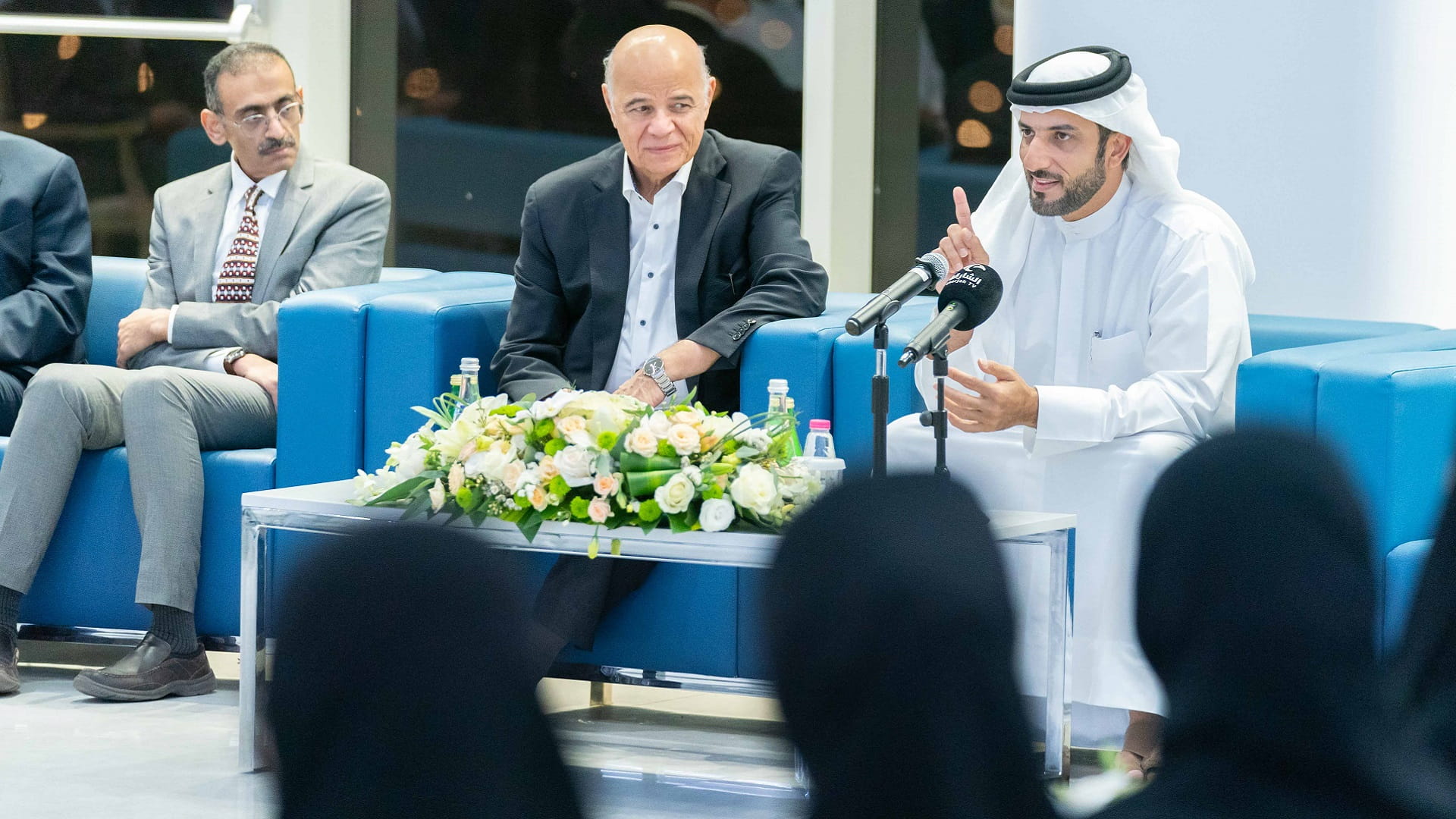During the meeting, Sheikh Sultan bin Ahmed listened to several proposals submitted by the students, including administrative and scientific matters. He also engaged in discussions with the attendees, including professors and students, about many constructive ideas presented by the students.