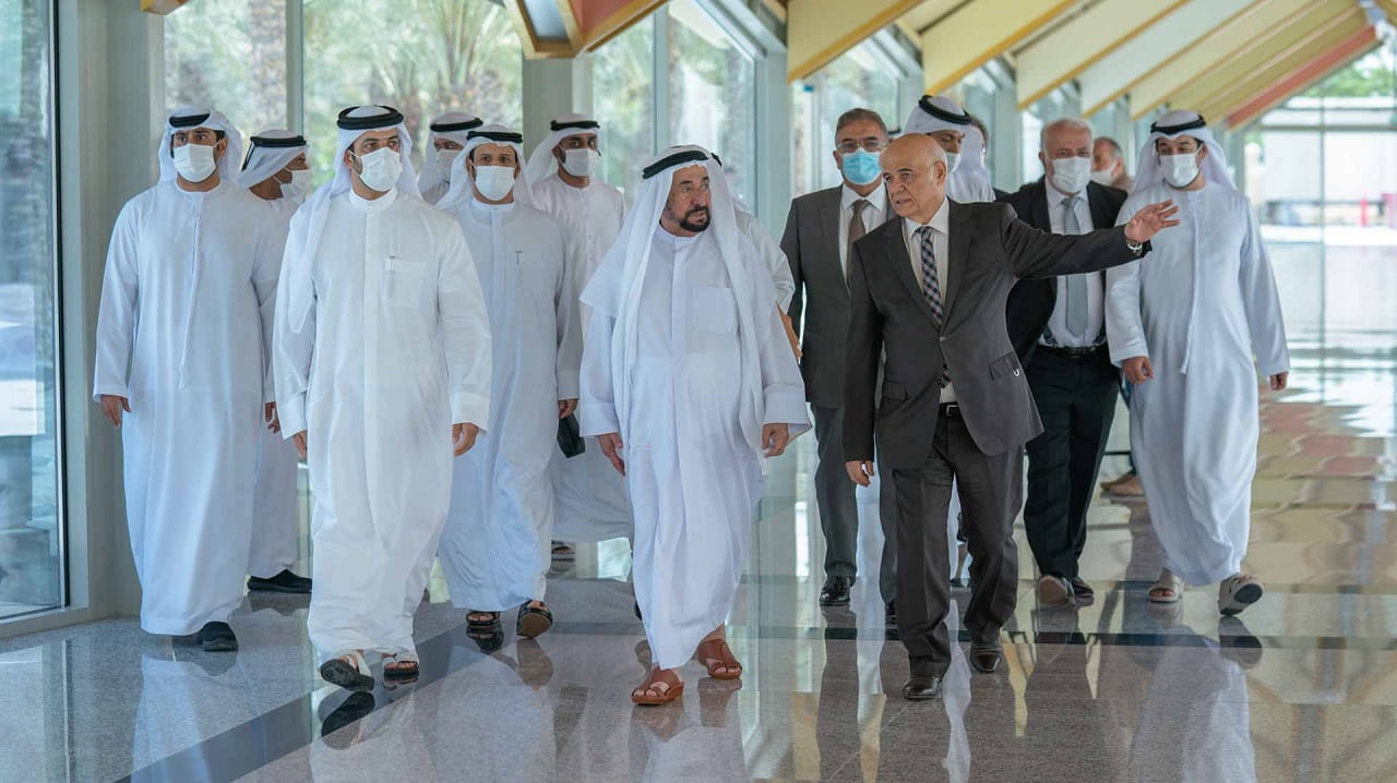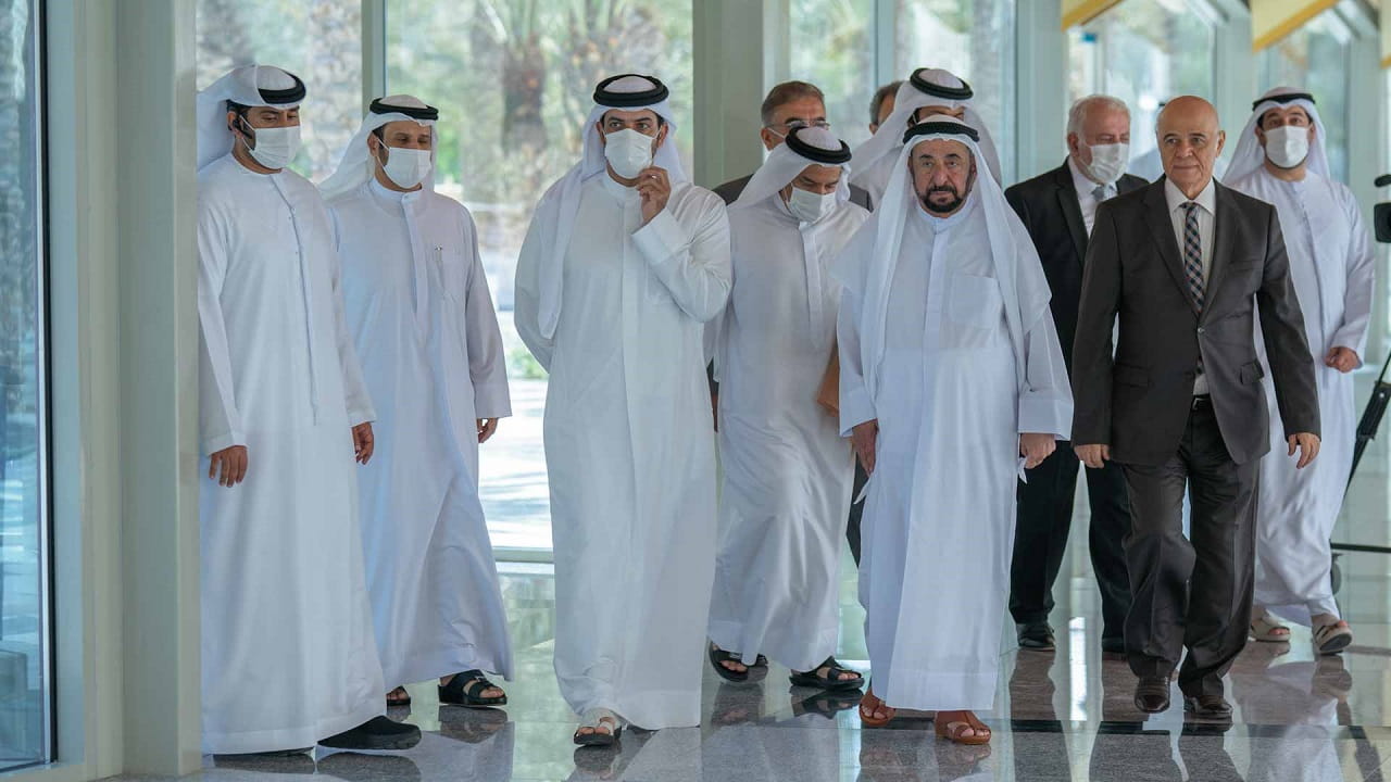 After the meeting, His Highness the Ruler of Sharjah inspected the new air-conditioned corridors project connecting all university buildings, including colleges, laboratories, the library, the restaurant hall, and others.