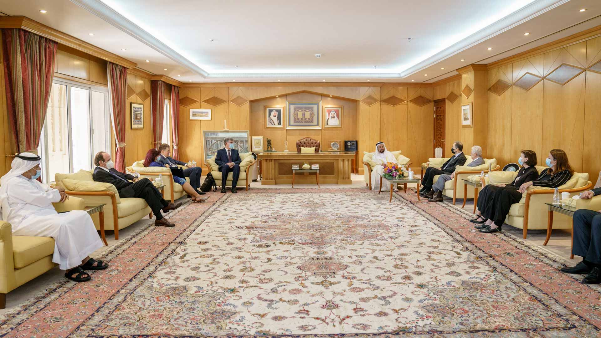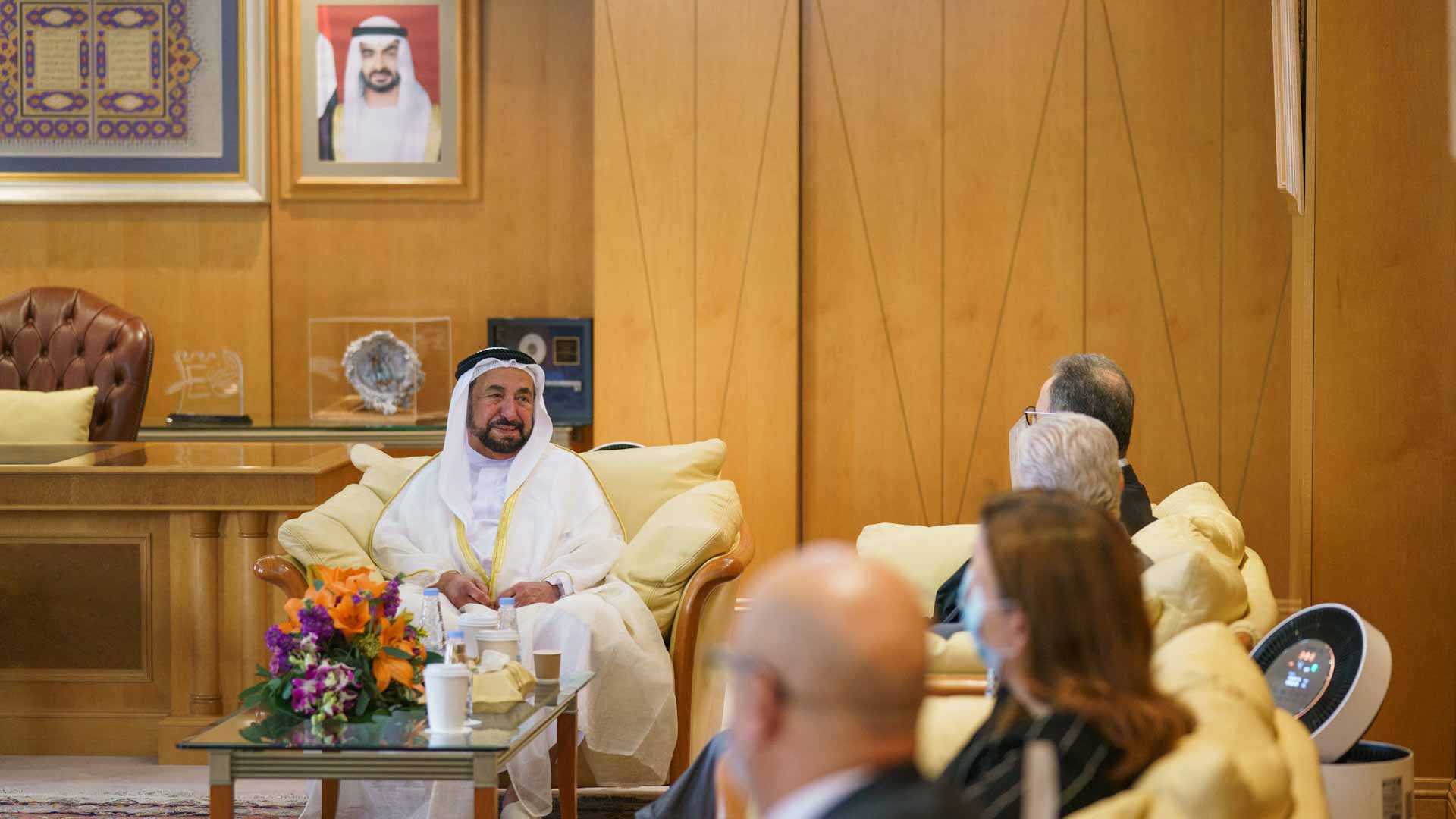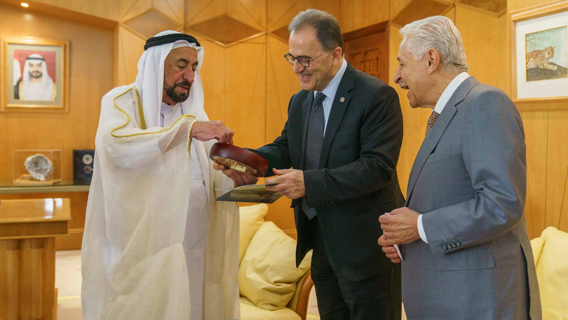 At the end of the meeting, His Highness the Ruler of Sharjah exchanged shields and souvenirs with the President of the American University in Cairo.