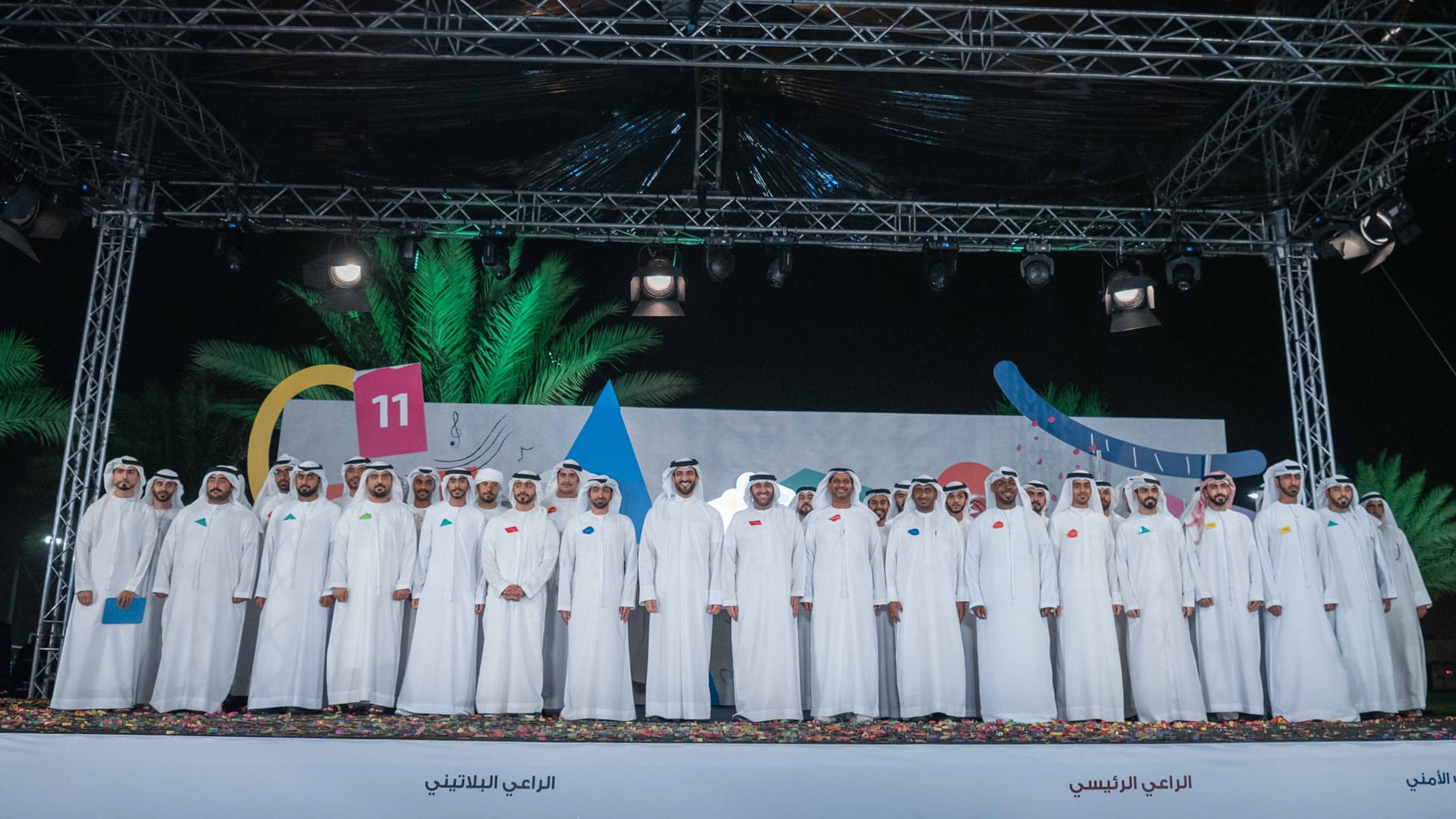 Then Khamis bin Salem Al Suwaidi read a poem entitled "Dawahi 11", followed by a traditional Emirati performance and various folklore performances from Africa, Russia, and Mongolia. At the end of the ceremony, Sheikh Sultan bin Ahmed took a souvenir photo with the festival's working team.