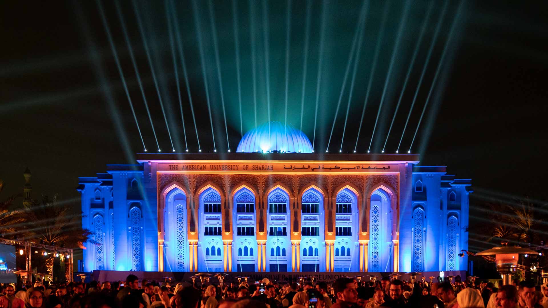 The dinner party was attended by His Highness the Ruler of Sharjah, Sheikh Saud bin Sultan bin Muhammad Al Qasimi, Director of the Sharjah Digital Office; Sheikh Tariq bin Faisal Al Qasimi; Abdullah Sultan Al Owais, Chairman of the Board of Directors of the Sharjah Chamber of Commerce and Industry, Muhammad Obaid Al Zaabi, Head of the Protocol and Hospitality Department; Salem Youssef Al Qasir, Chairman of the Labor Standards Development Authority; Dr. Khaled Omar Al-Midfa, President of Sharjah Media City "Shams", members of the University's Board of Trustees, faculty and administrative staff, and 3,500 graduate students.