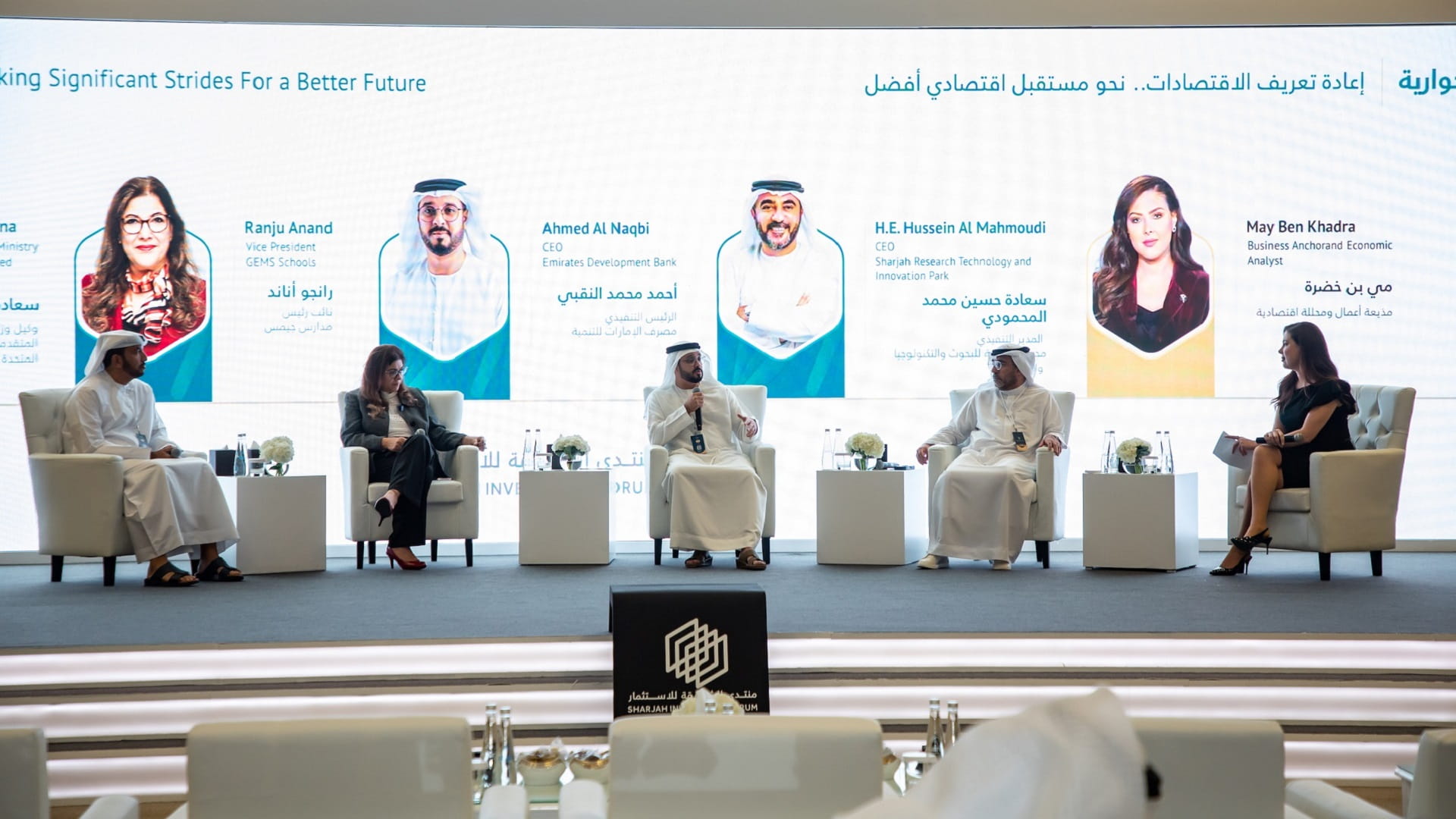 Ahmed Bin Saed, Deputy Director of Commercial Affairs Department, Sharjah Economic Development Department (SEDD), Mariam Bin Al Shaikh, Director of Sharjah Business Women Council (SBWC), Ahmed Al Khoshaibi, Group CEO of Arada, Ahmed Mohamed Abu Eideh, CEO of Invest Bank and Yousif Khalil, Managing Director of MBR Gulf, attended at the panel discussion, moderated by Auhood Bin Jber Al Kholani, journalist and radio presenter on Al Khaleejiya 100.9 radio station.